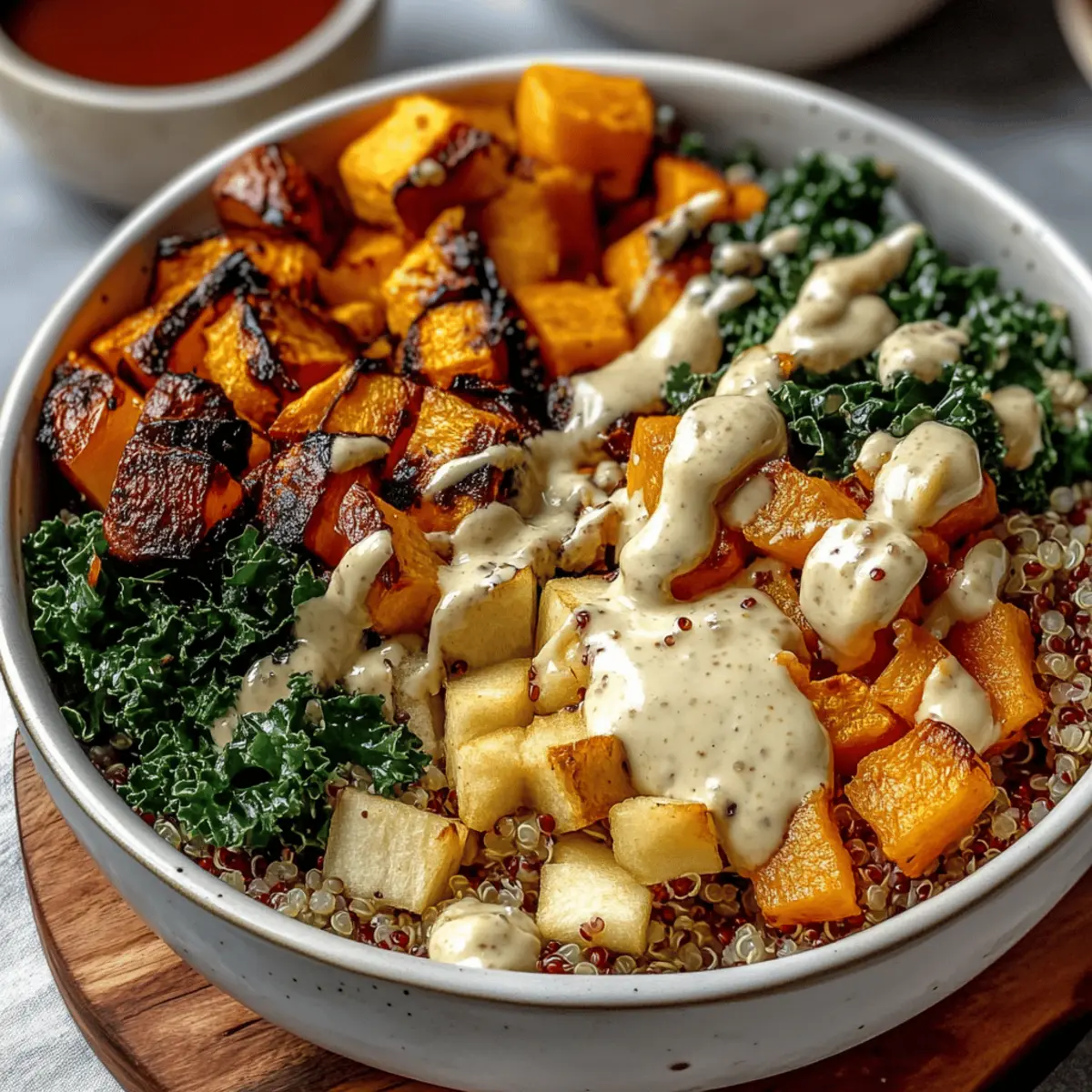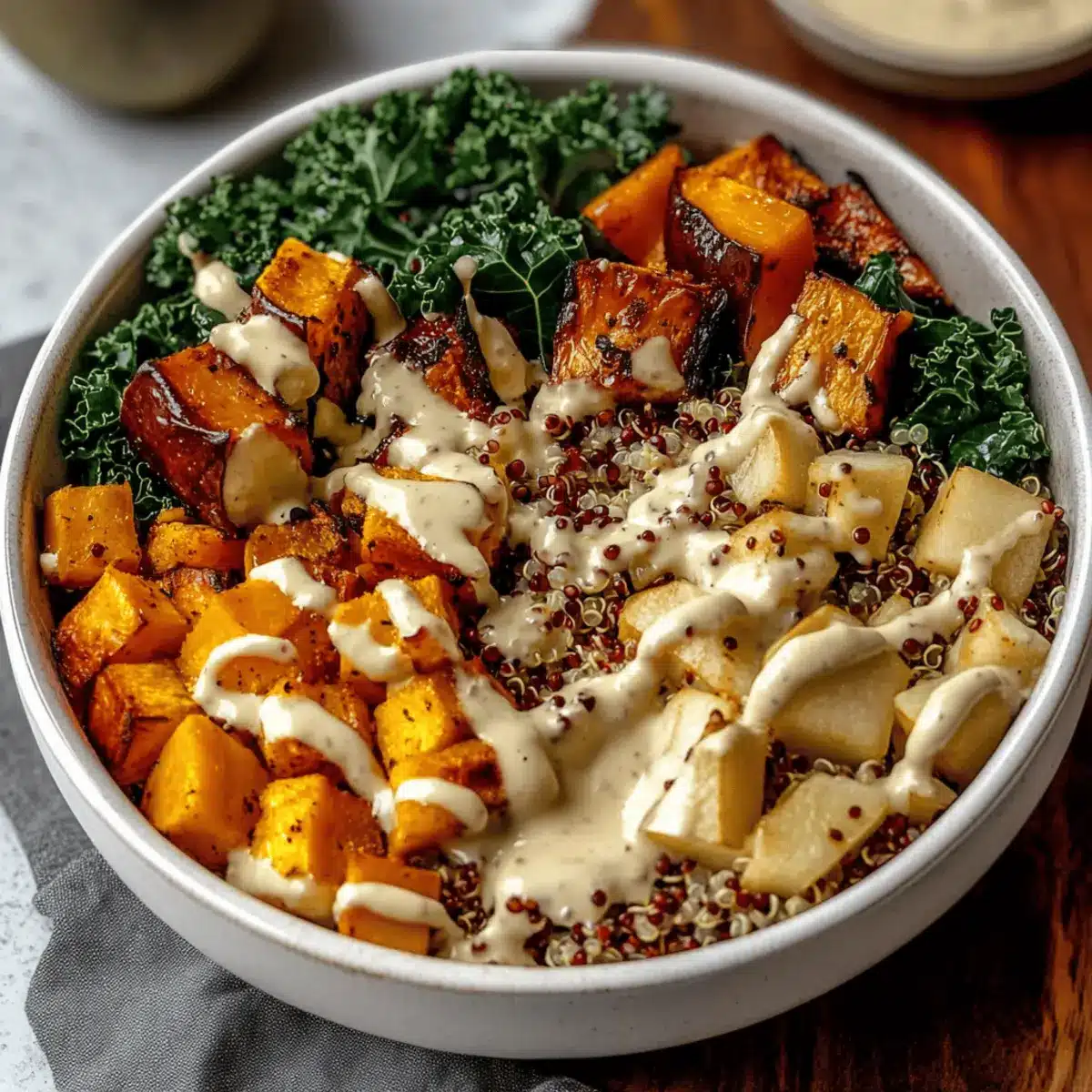 - Drizzle the maple-tahini dressing generously over each bowl. Serve warm or chilled, optionally sprinkle with pumpkin seeds or chopped pecans.