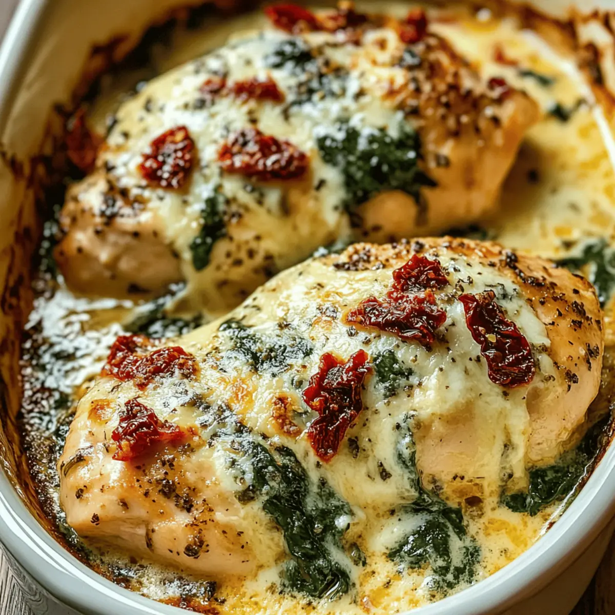 Spread the creamy sauce evenly over the seasoned chicken in the baking dish, ensuring every piece is well-coated. Drizzle the sun-dried tomato oil over the top for an added layer of flavor. Scatter the sun-dried tomatoes around the dish, which will lend a delightful tanginess to the casserole as it bakes.