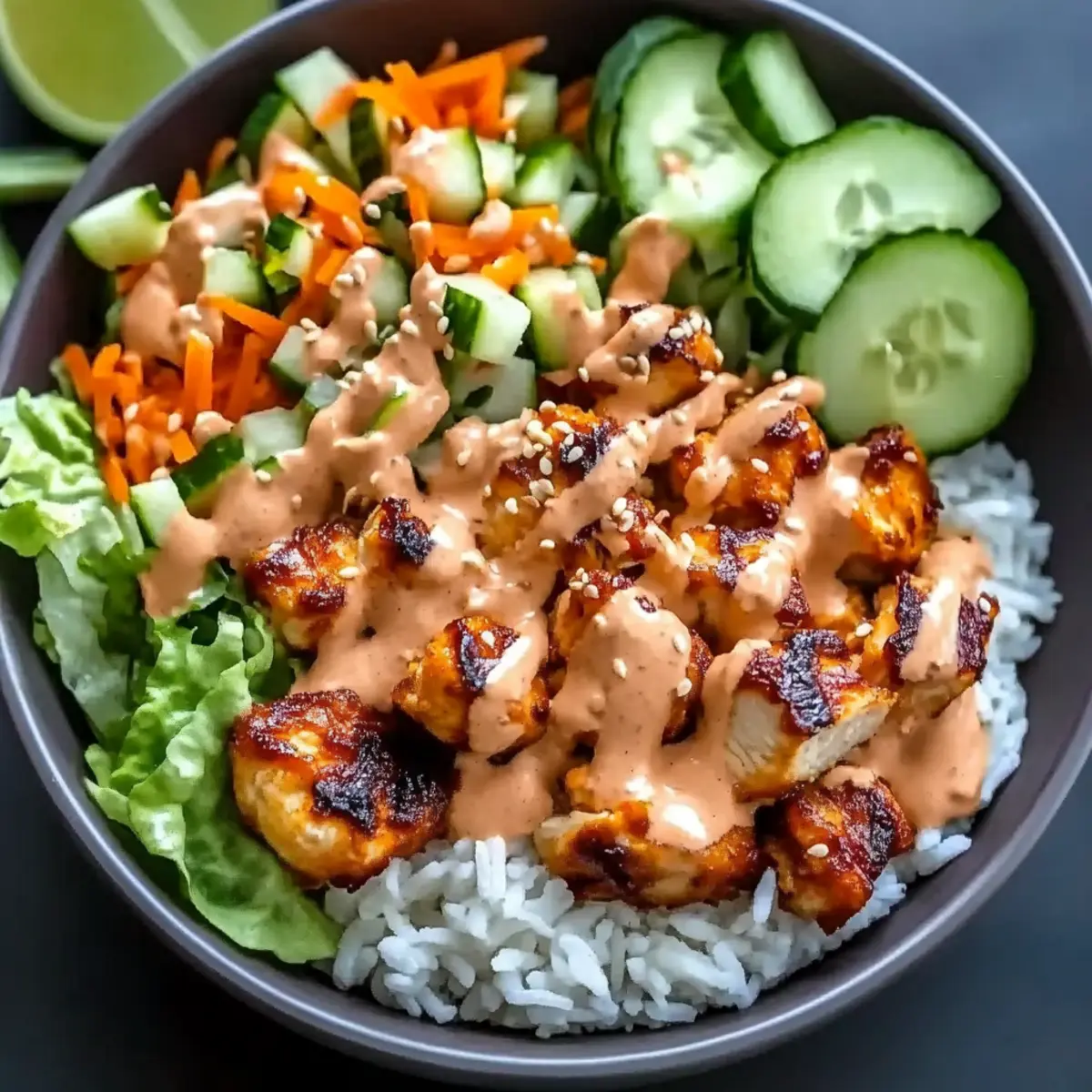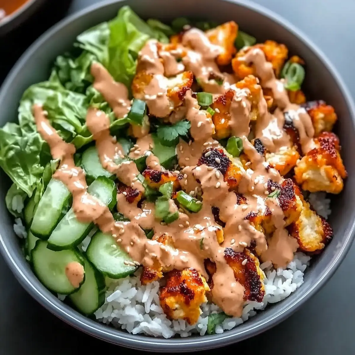 Begin creating your delicious Bang Bang Chicken Bowl by placing a generous serving of cooked jasmine rice at the base. Layer on the crispy fried chicken, followed by a colorful mix of fresh toppings: shredded lettuce, diced cucumber, shredded carrots, and chopped green onions. Top it all off with a drizzle of the spicy mayo sauce.