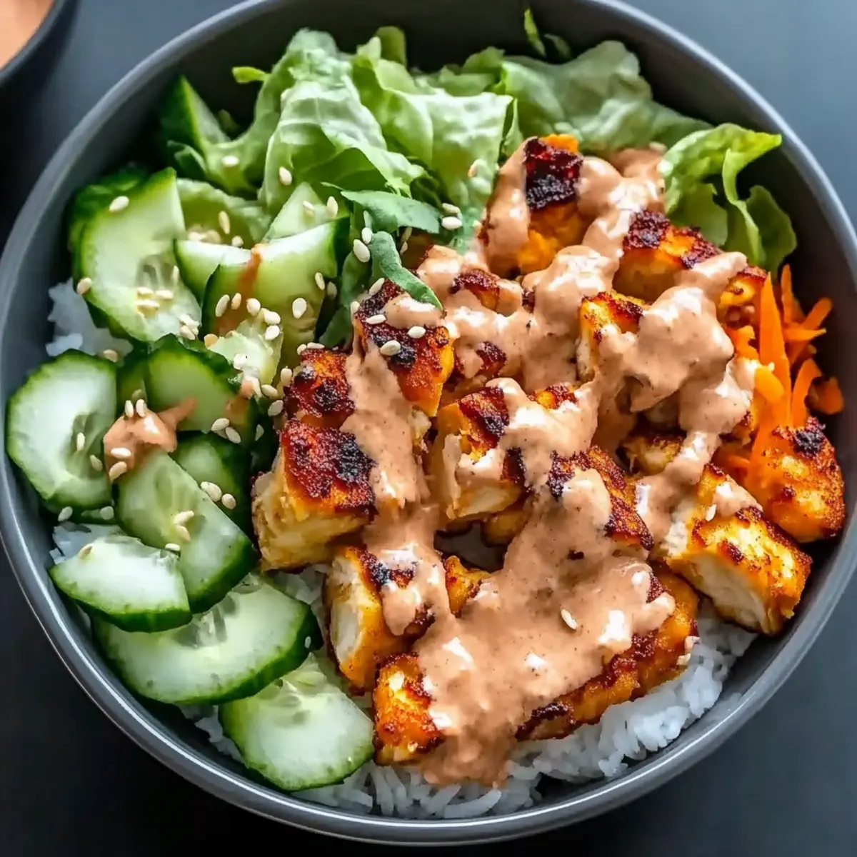 Tangy Cucumber Salad: A refreshing side with thinly sliced cucumbers, sesame oil, and rice vinegar brings a bright contrast to the rich, creamy sauce of the bowl and balances the spice beautifully.