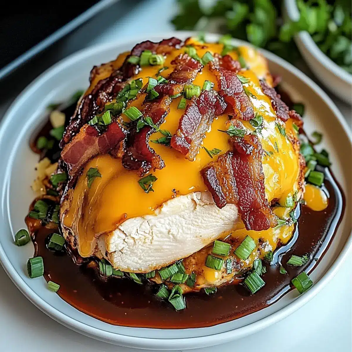 Once out of the oven, sprinkle chopped green onions over the top for a burst of fresh flavor. If you prefer a little heat, feel free to add a sprinkle of red pepper flakes. Allow the dish to rest for a few minutes before slicing. This will help the juices redistribute, keeping your Cowboy BBQ Bacon Cheddar Chicken tender and juicy when served.