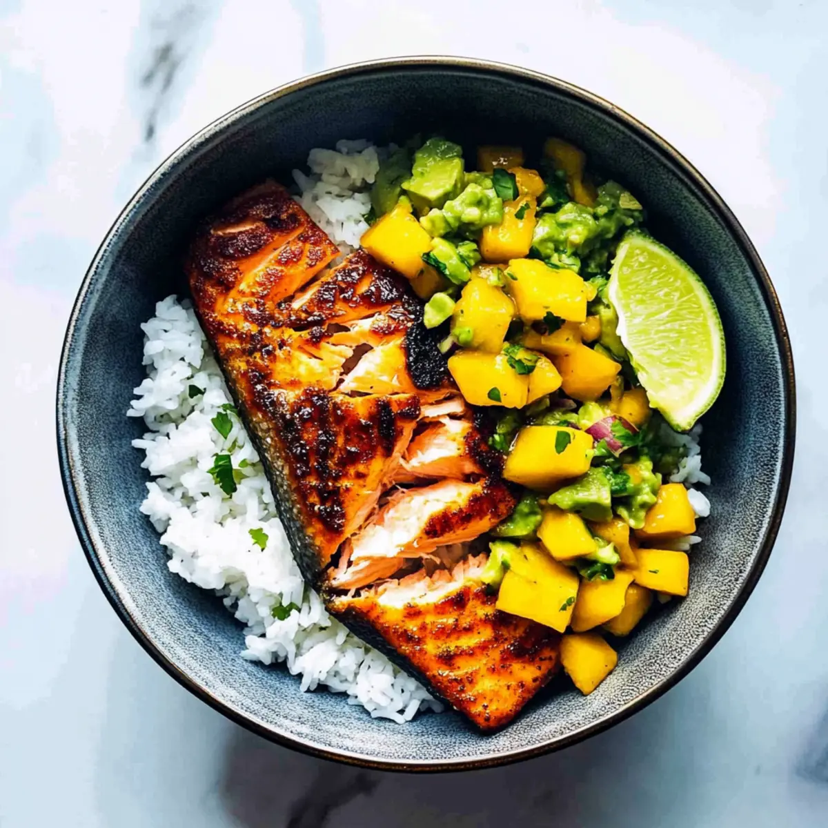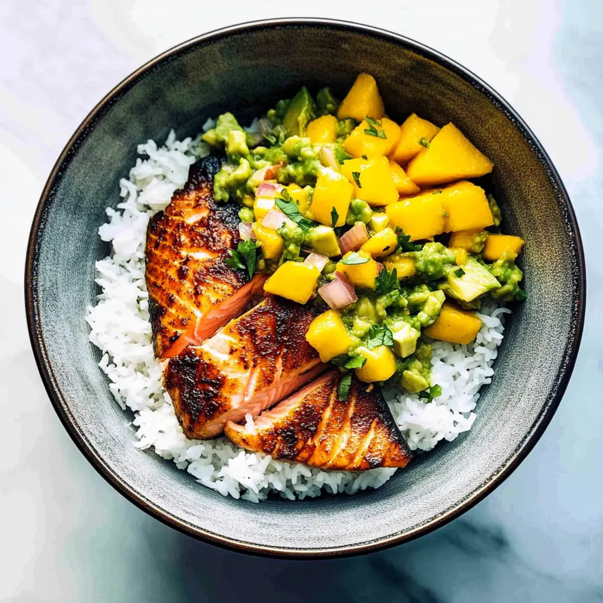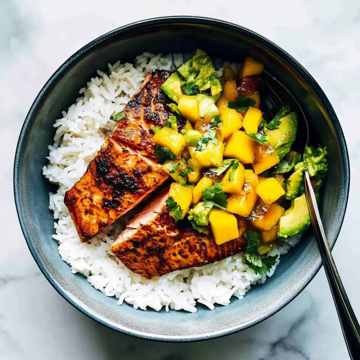 BBQ Salmon Bowls with Mango Avocado Salsa for Easy Sips