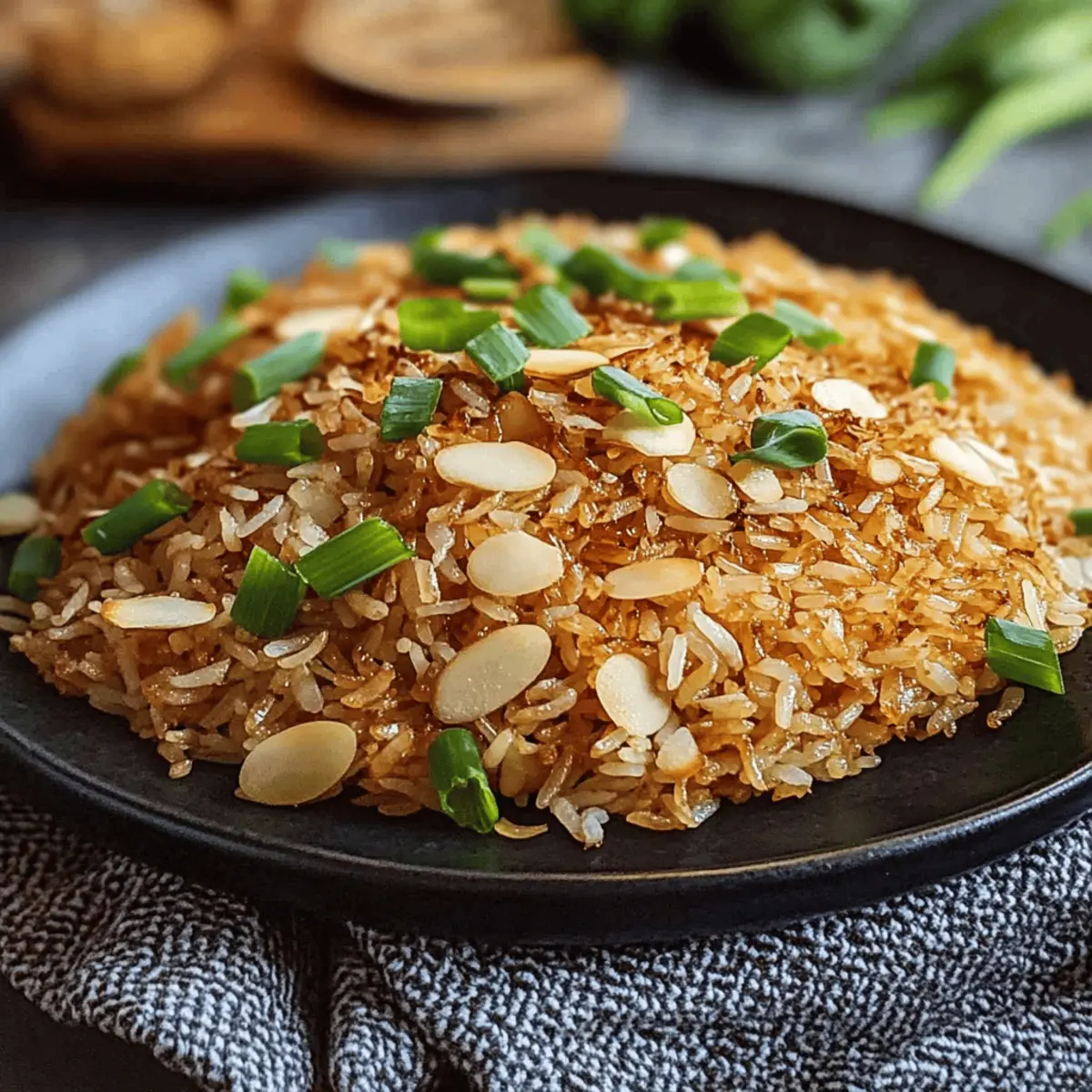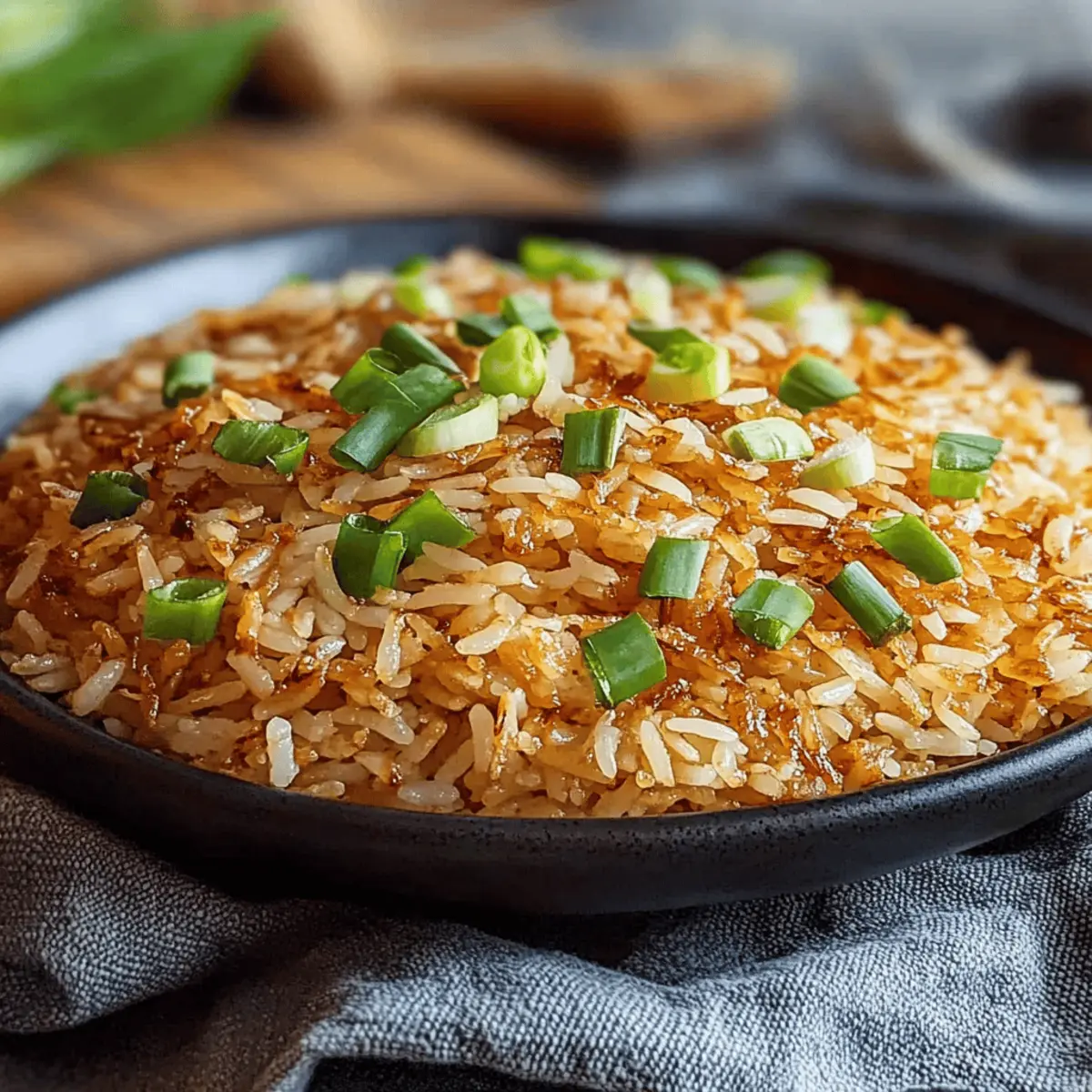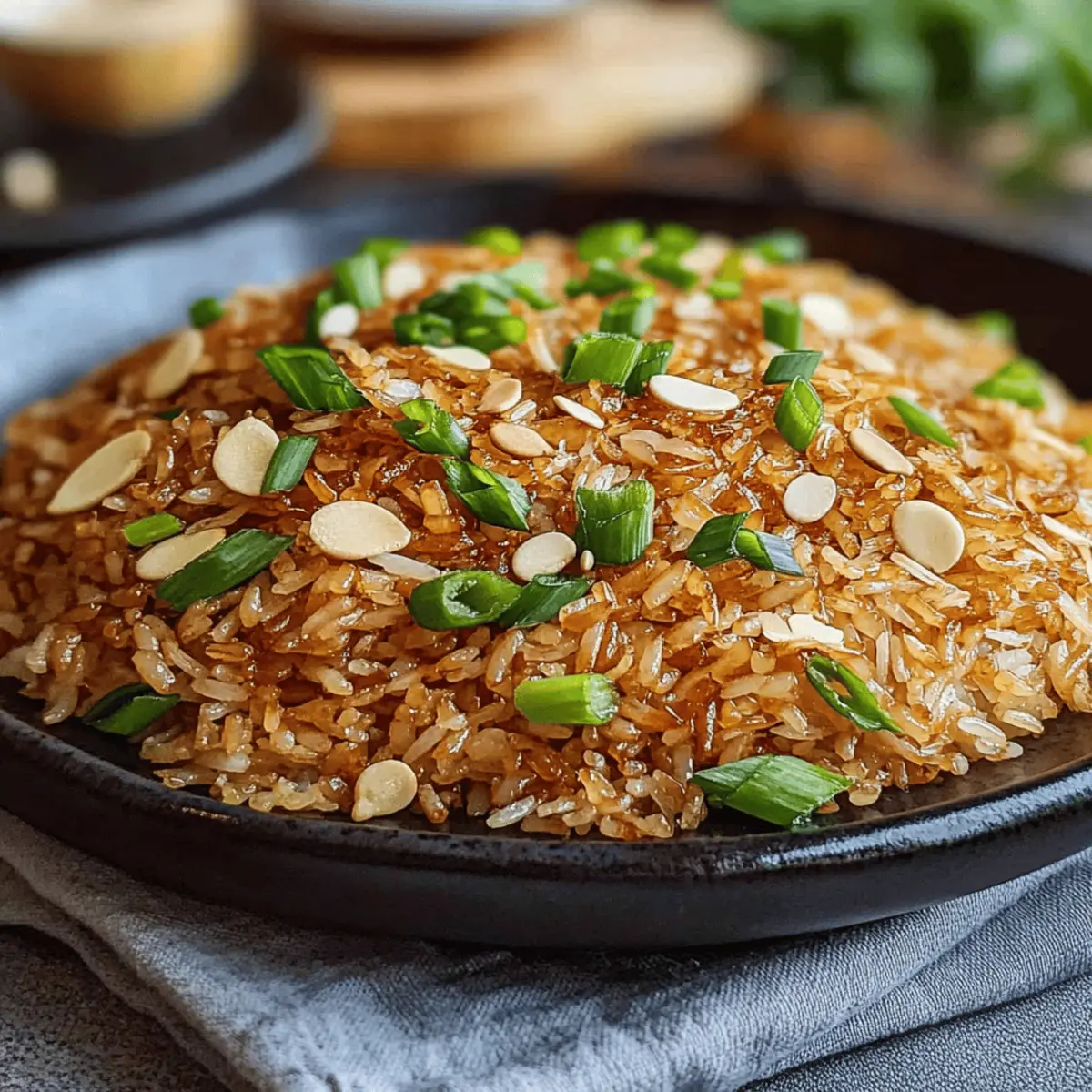 Once the bottom is golden and crispy, remove the pan from heat. Sprinkle the rice with chopped green onions and drizzle with 1 teaspoon of sesame oil for extra flavor. Let the rice rest for 5 minutes, allowing the crisp layer to set before serving. This resting time helps enhance the dish’s presentation and texture, making it even more delightful to enjoy.