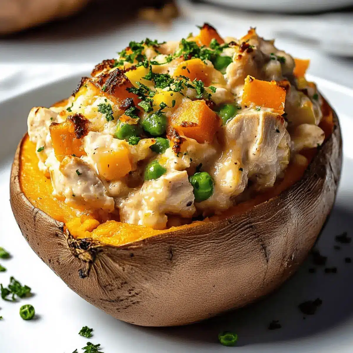 Creamy High-Protein Chicken Pot Pie Stuffed Sweet Potatoes Delight