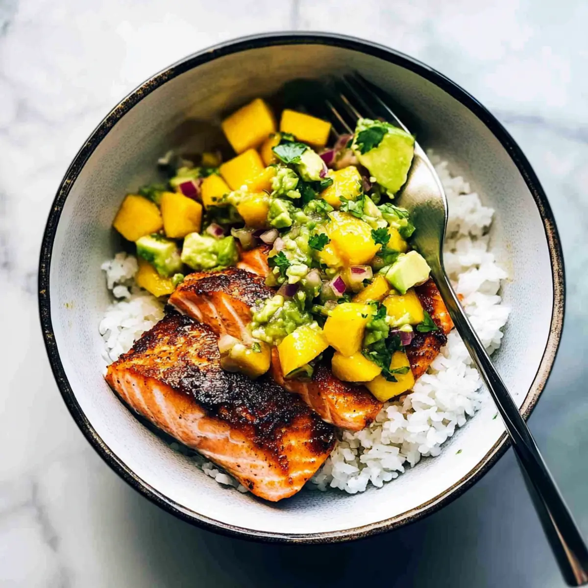 BBQ Salmon Bowls with Mango Avocado Salsa for Easy Sips