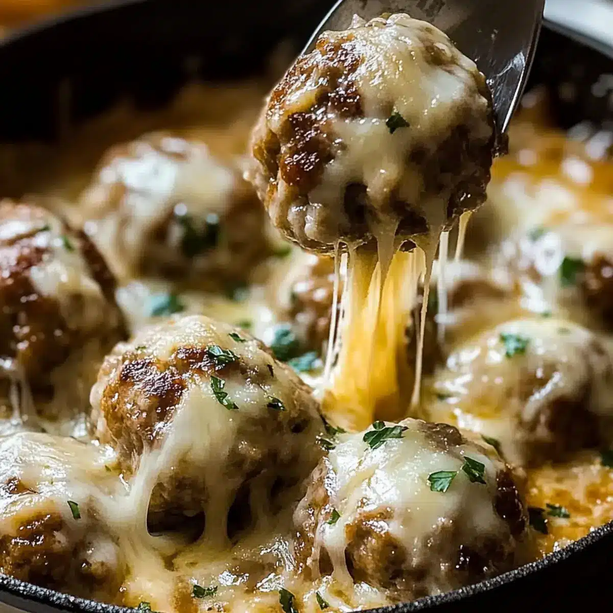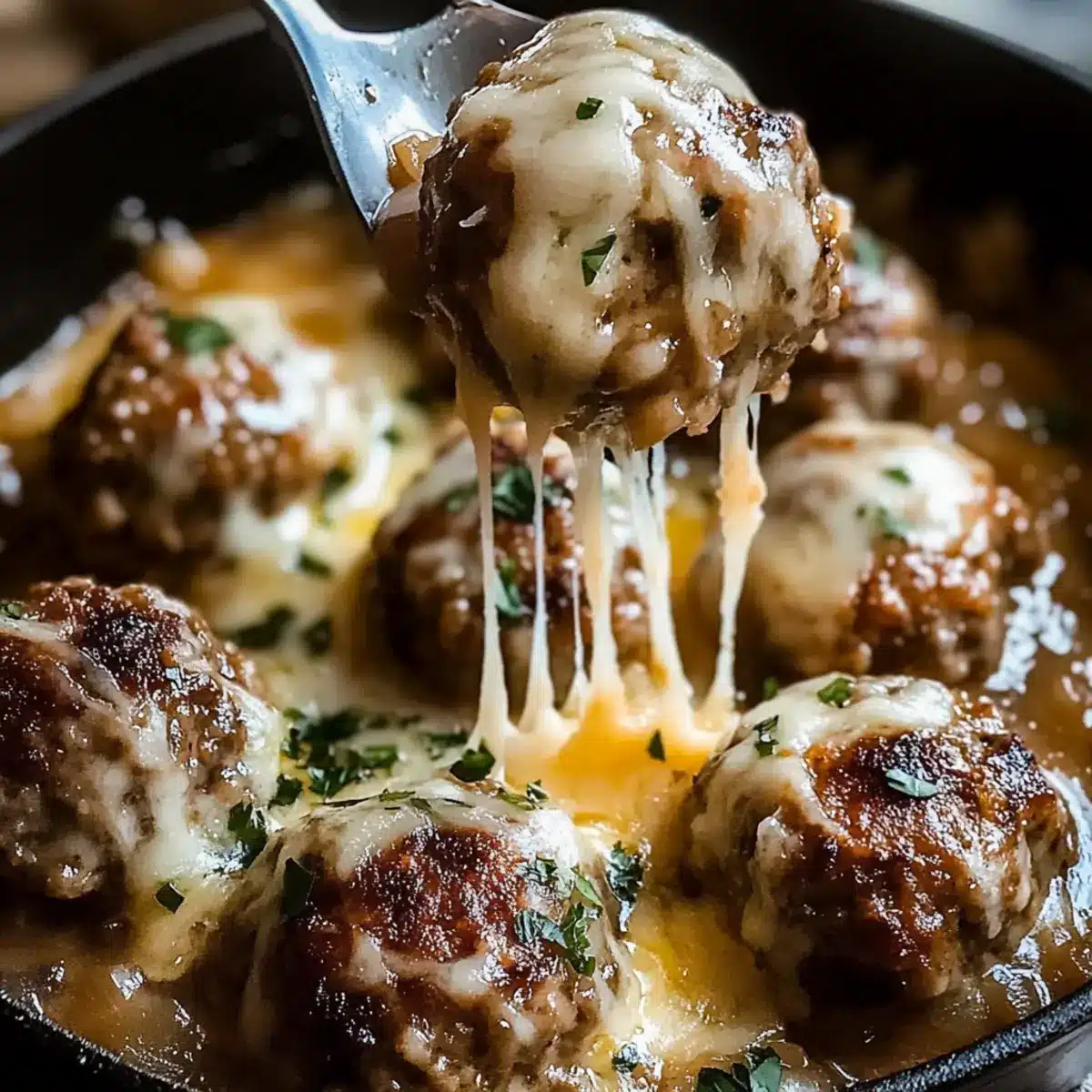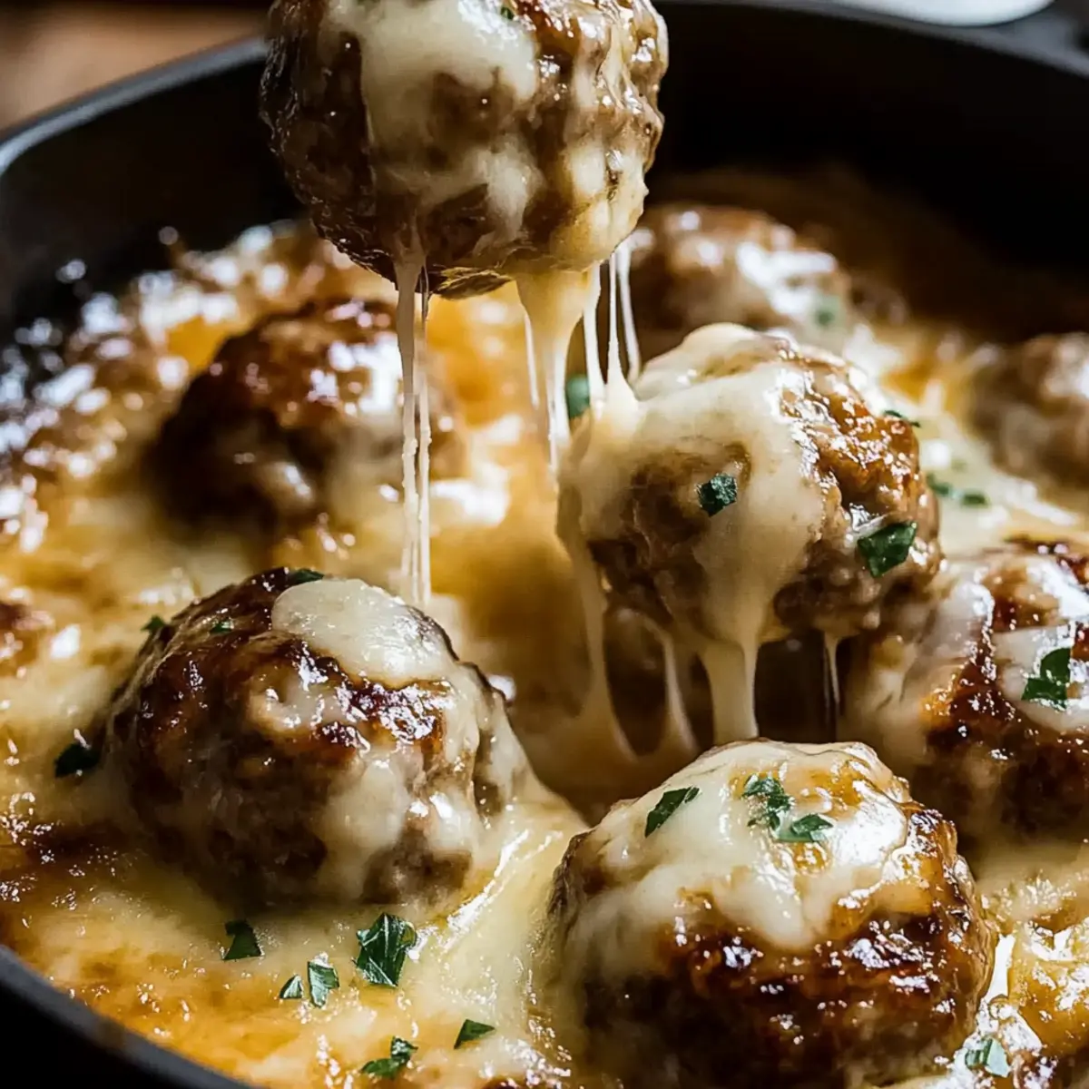 Preheat your oven broiler while the meatballs simmer. Once the meatballs are fully cooked and the sauce is thickened, sprinkle a generous layer of shredded Gruyère cheese over the top. Cover the skillet and broil for 2-3 minutes until the cheese is bubbling and golden. Keep a close eye to prevent burning—this is the delightful finishing touch for your Cheesy French Onion Meatballs!