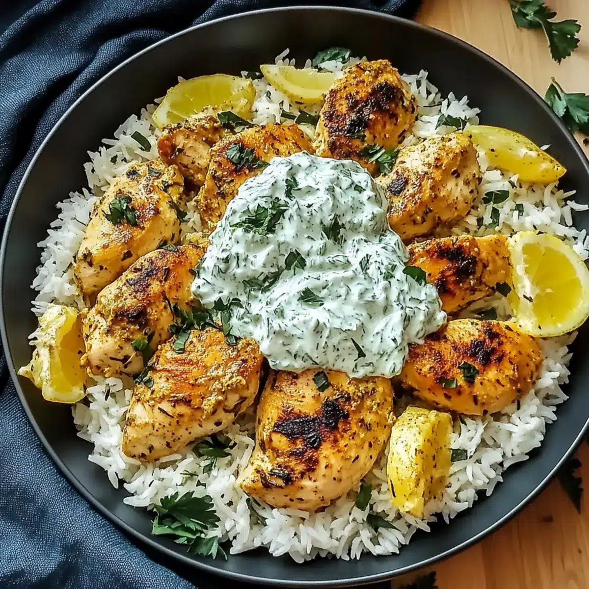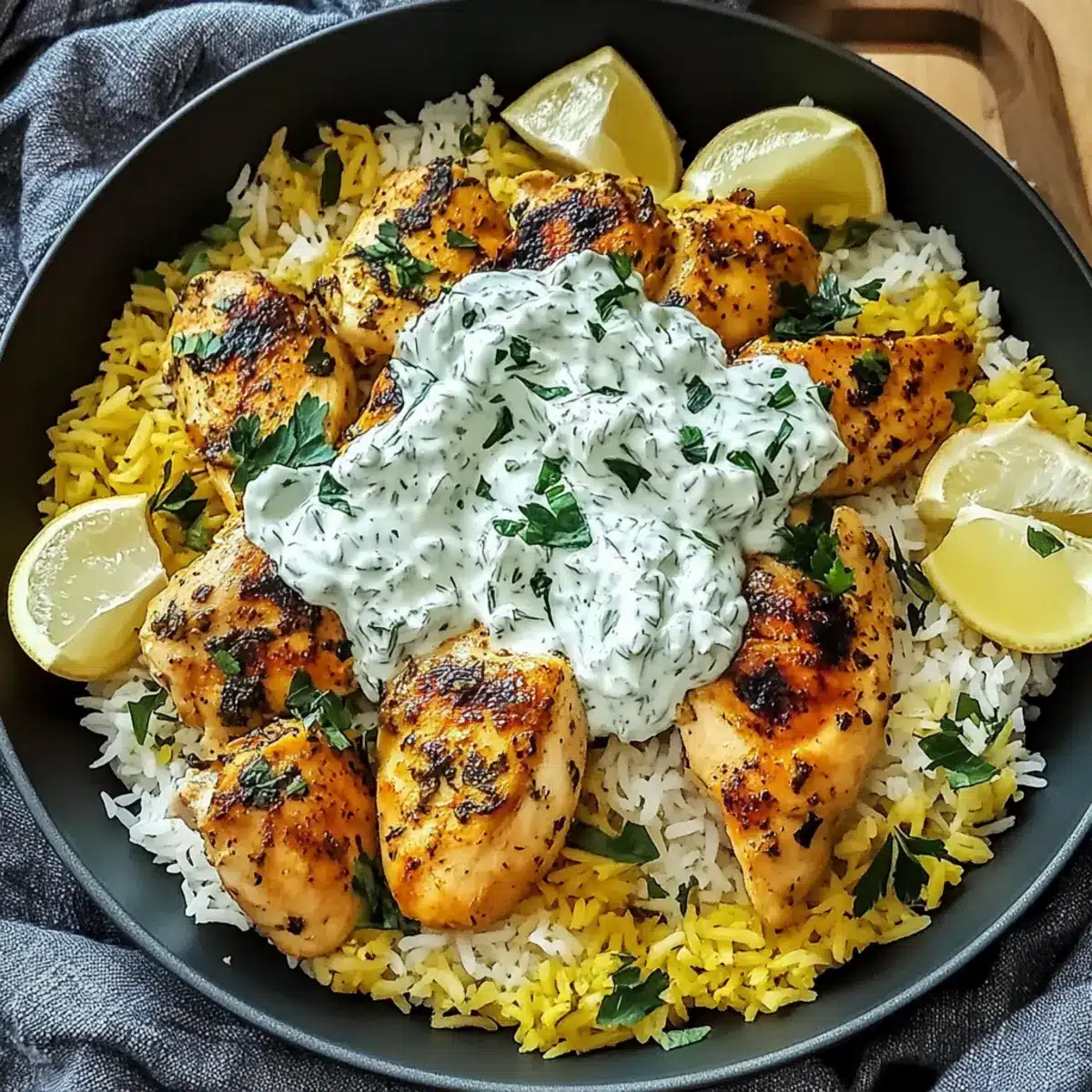 Mediterranean Flavor Explosion: The fresh tzatziki sauce infused with dill, garlic, and lemon brings a creamy tang that beautifully complements the tender chicken and fluffy rice.