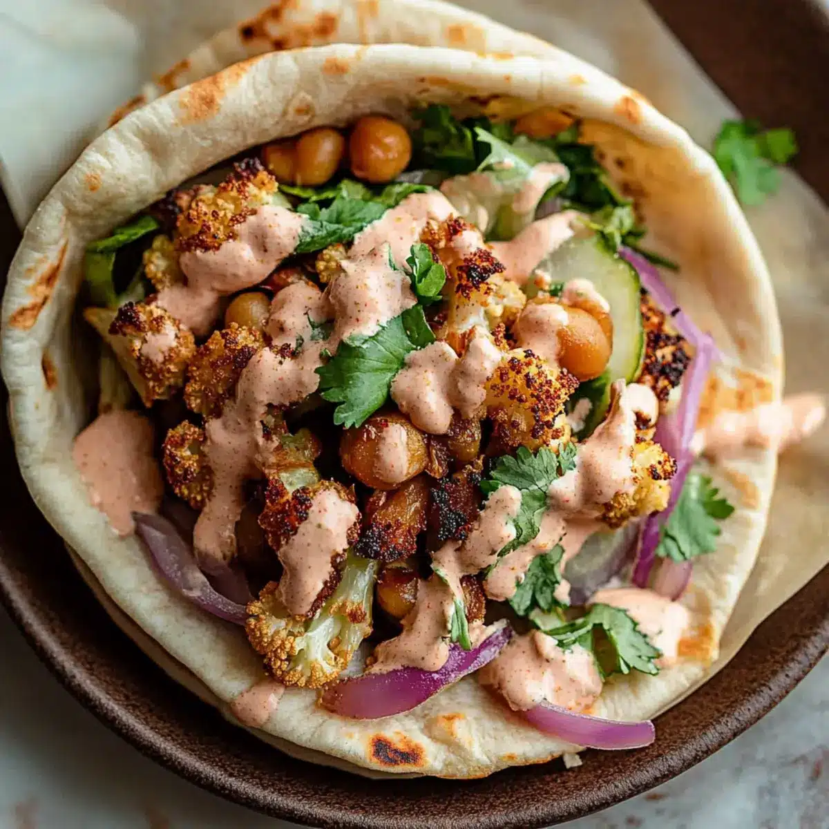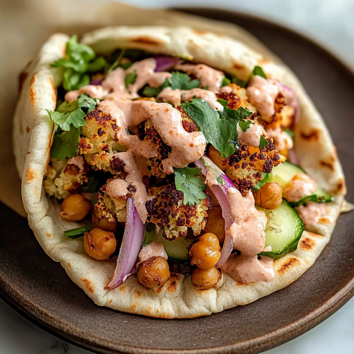 To assemble each wrap, take a warm pita and lay down a layer of leafy greens. Then, spoon in a generous portion of the chickpea and cauliflower mixture, followed by a few pieces of pickled onions for that tangy crunch. Wrap it up tightly, allowing the delicious flavors to meld together, and prepare to dig in!