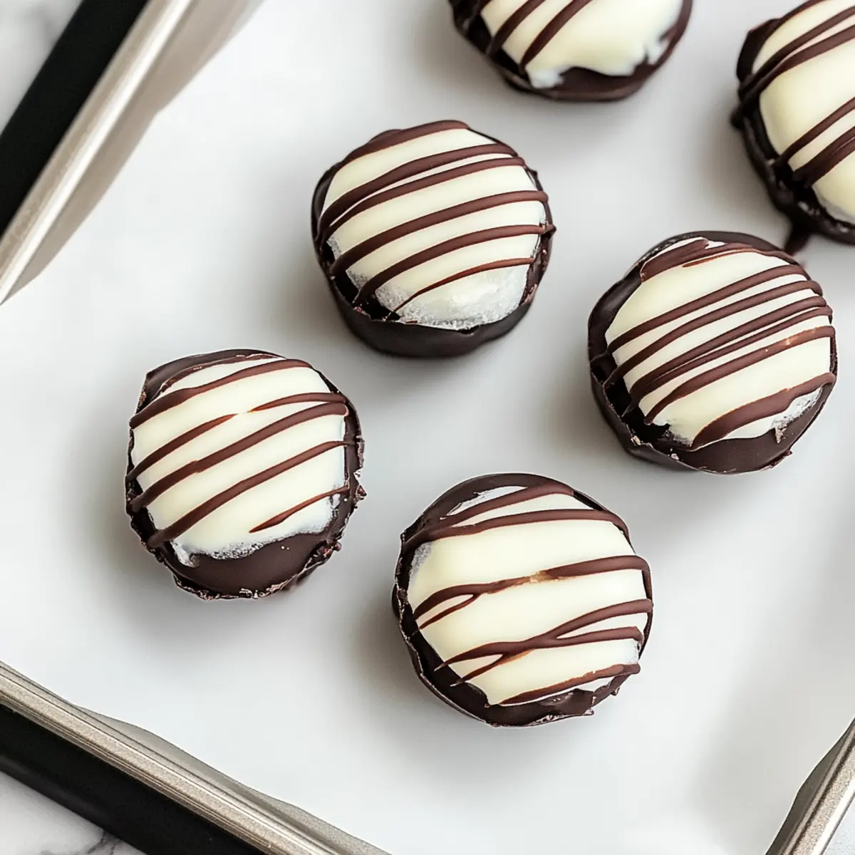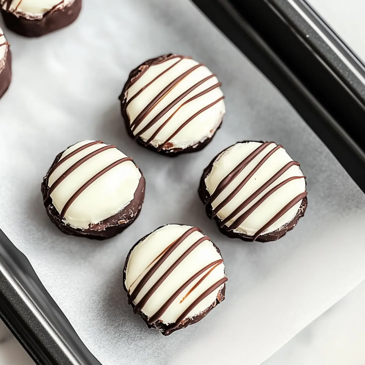 Spoon the melted chocolate into a piping bag or a zip-top bag with a corner snipped off. Carefully drizzle a zig-zag pattern over each peppermint round, allowing the chocolate to cascade beautifully across them. This decorative touch not only enhances the look but adds an irresistible chocolate layer to your creamy treat.