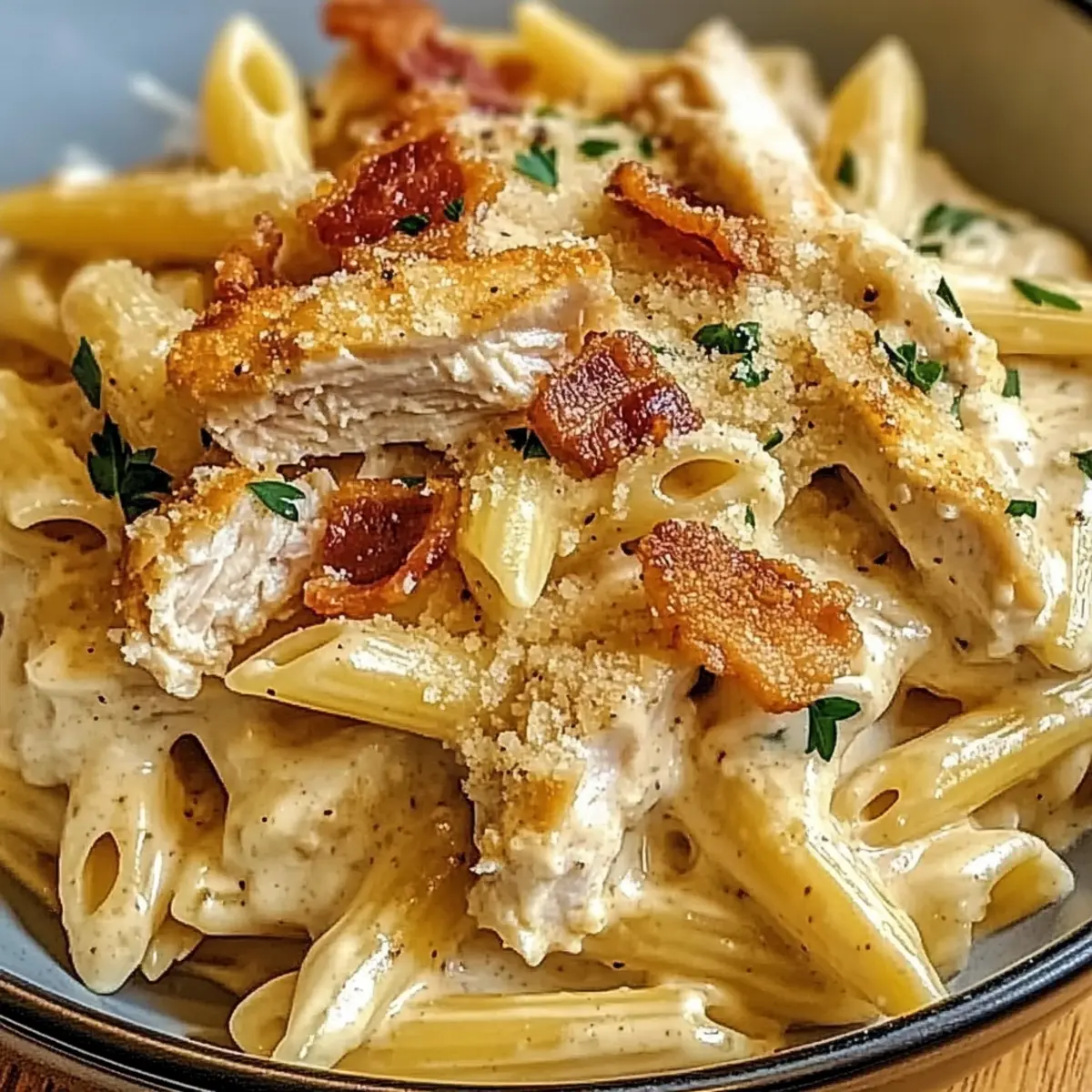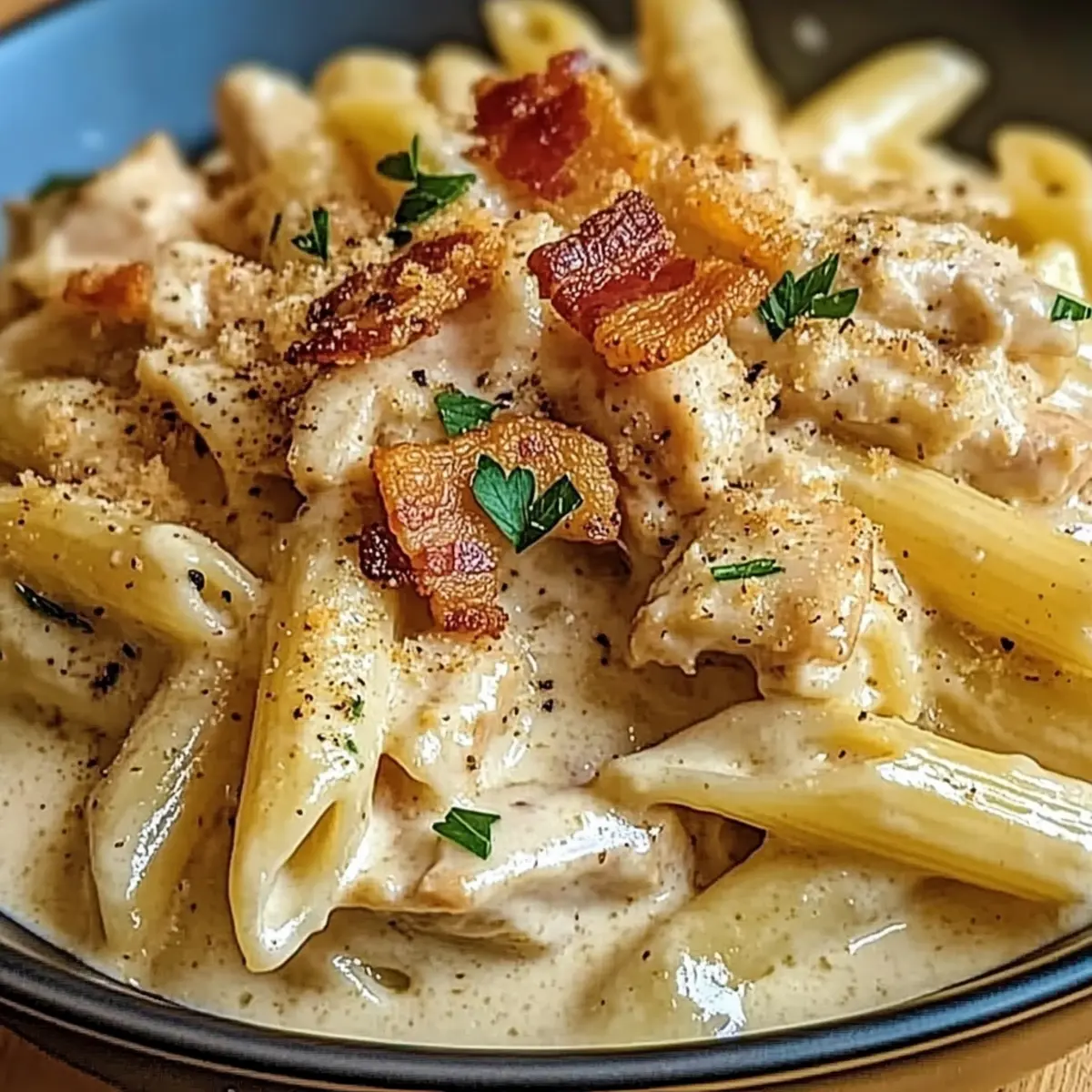 - Plate the creamy Crack Chicken Penne, garnish with remaining bacon and parsley. Serve hot.