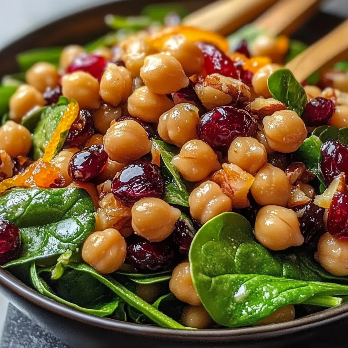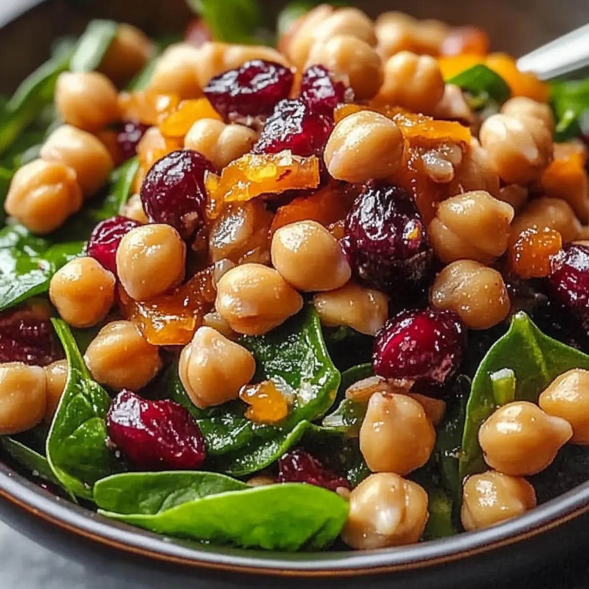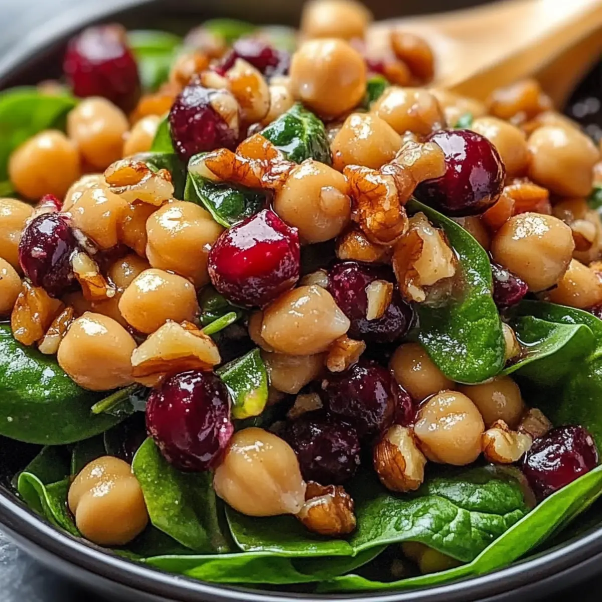 - In a large mixing bowl, combine chickpeas, spinach, cranberries, walnuts, and red onion. Toss gently to distribute ingredients.
