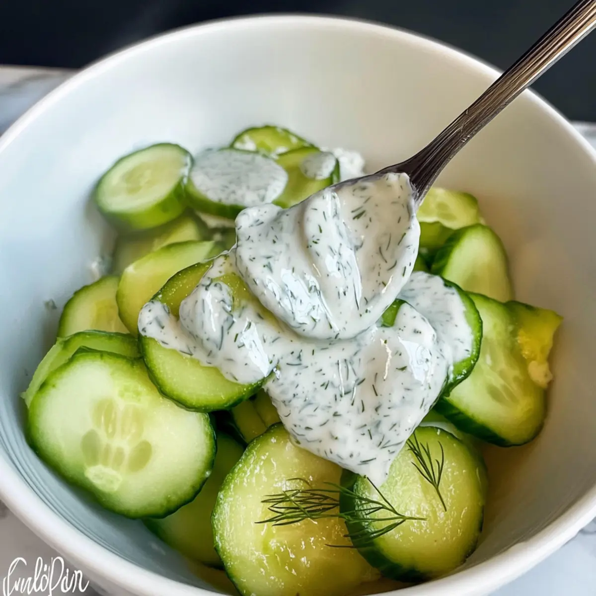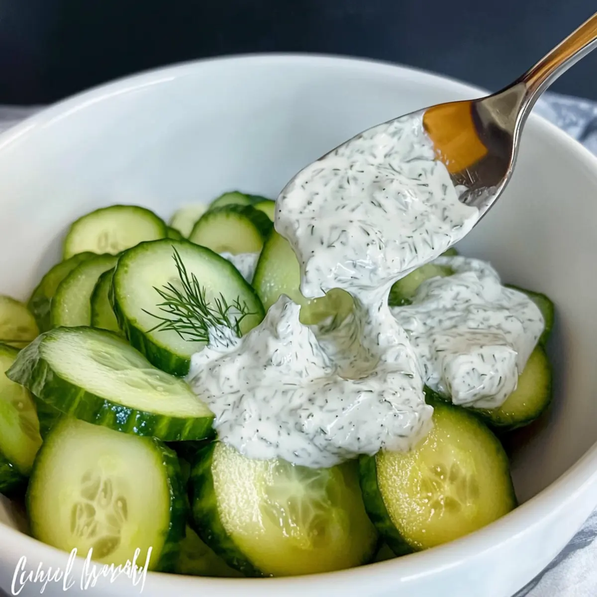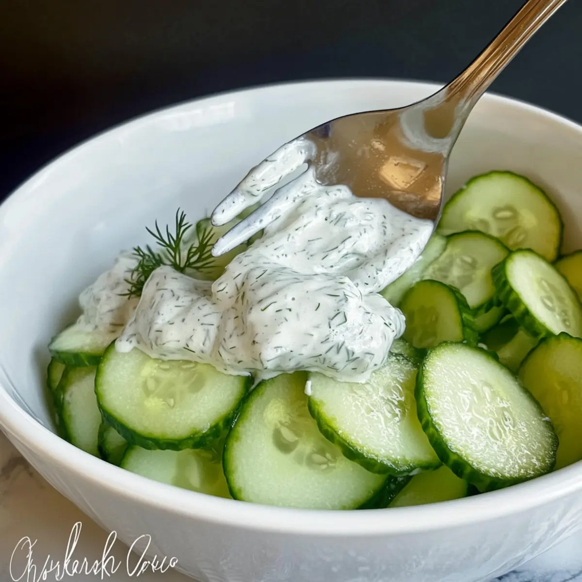 - Pour the dressing over cucumber slices and gently toss to coat.