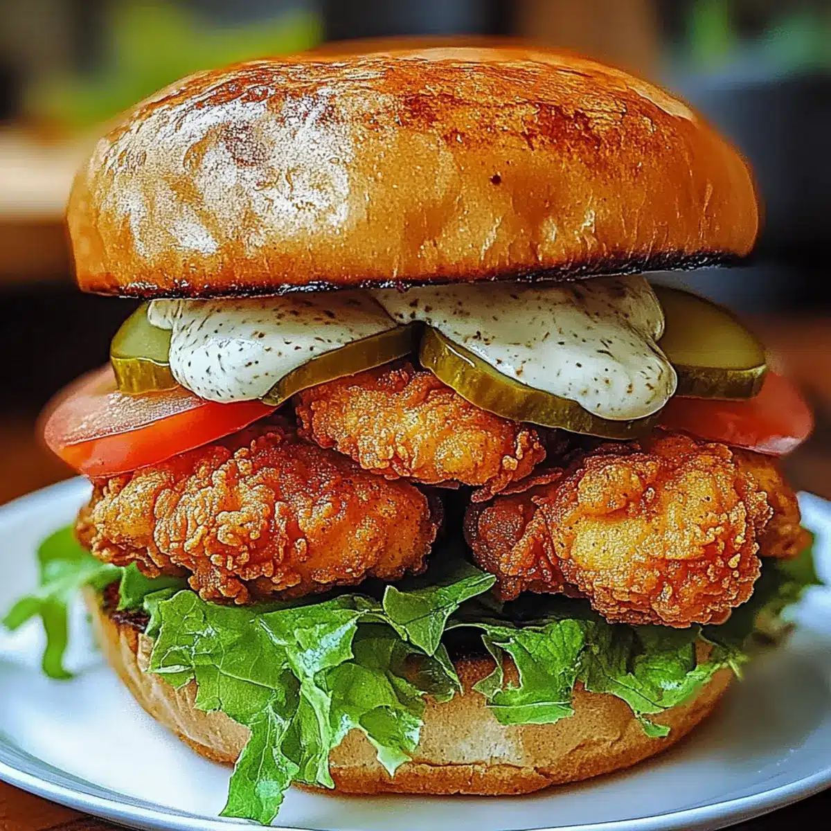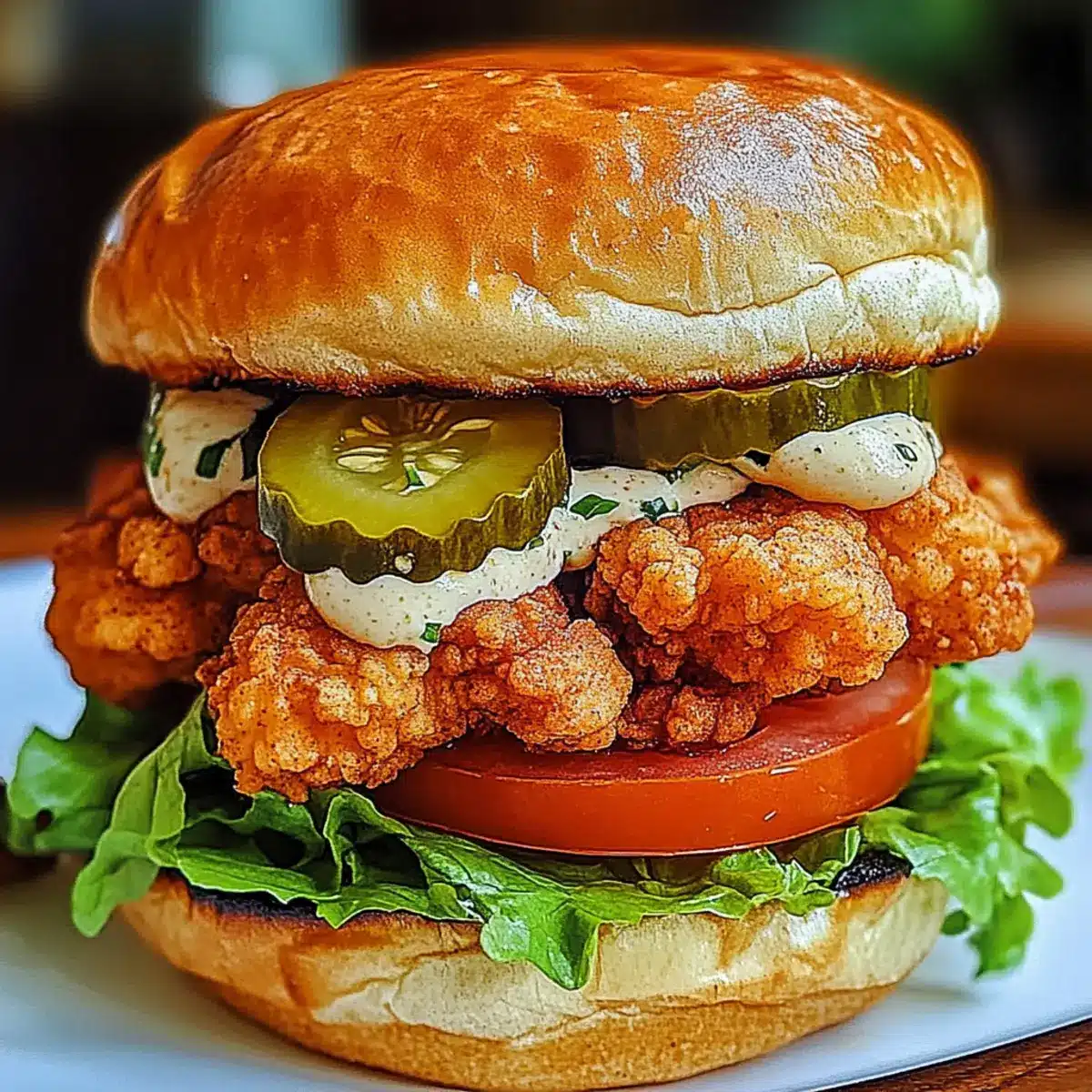 - Assemble the sandwich by spreading mayonnaise on the bottom half of the bun, layering lettuce, crispy chicken, tomato slices, and pickles, then topping with the other half of the bun.