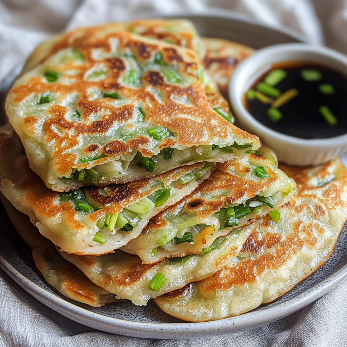- Continue cooking the remaining pancakes, adding a bit more oil to the skillet as needed. Once all your Crispy Chinese Scallion Pancakes are cooked and crispy, slice them into wedges. Serve them warm with a small bowl of soy sauce or black vinegar for dipping.