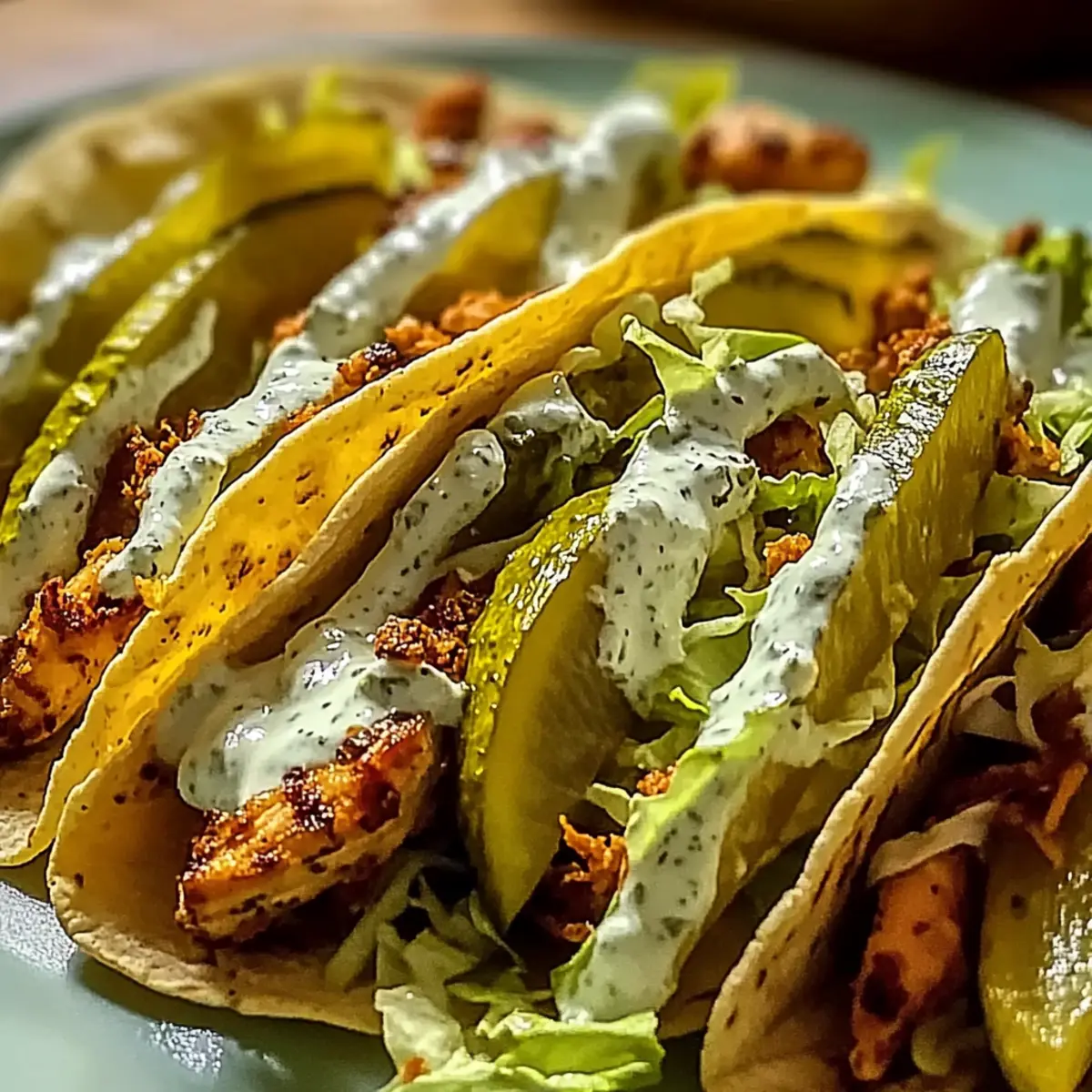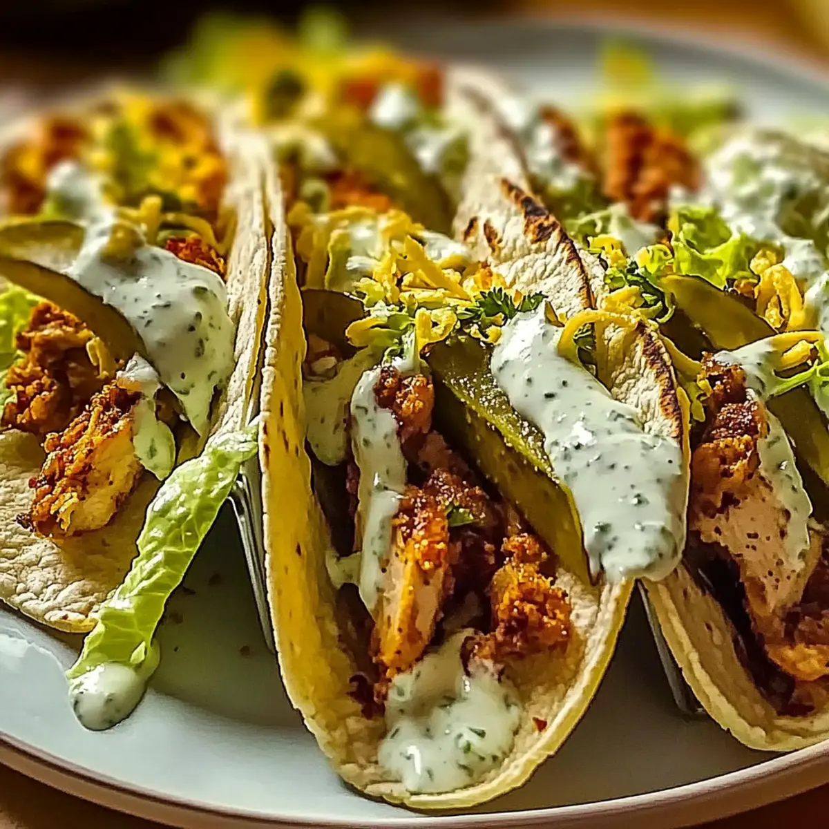 To assemble your tacos, lay a warm tortilla on a plate and spoon a generous amount of the seasoned chicken in the center. Top with crispy cheese laces, a handful of shredded cabbage, and slices of dill pickles. Drizzle with the creamy ranch sauce, and let it melt into all the components for that burst of flavor in every bite.