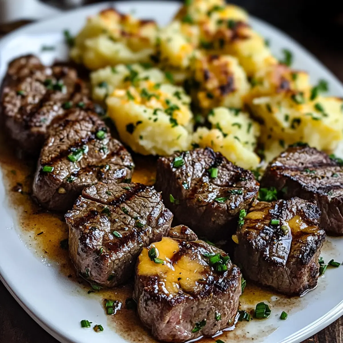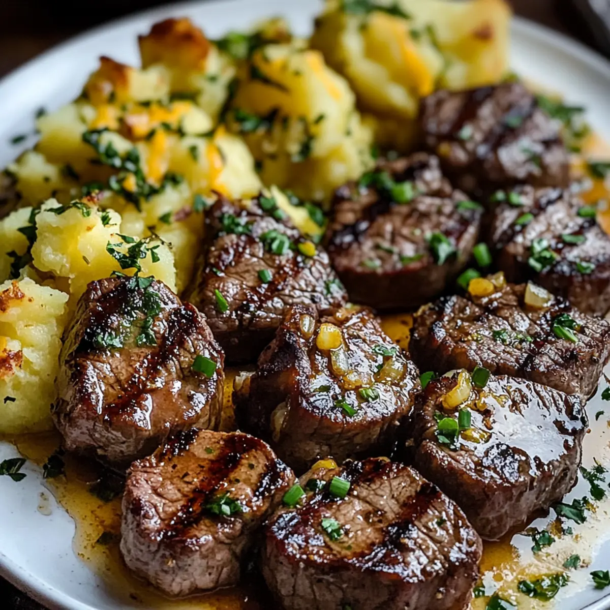 Garlic Butter Steak Bites and Cheesy Smashed Potatoes Bliss