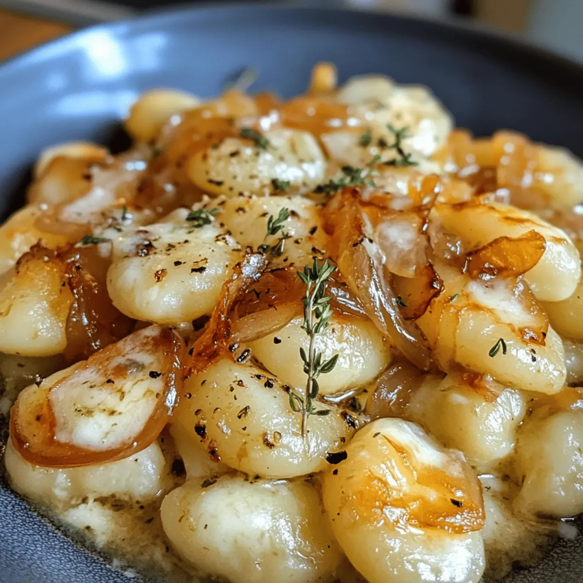 - Once your Gnocchi with Caramelized Onions and Gruyère is piping hot and well-combined, transfer it to serving plates or a large dish. Optionally, garnish with fresh thyme leaves.