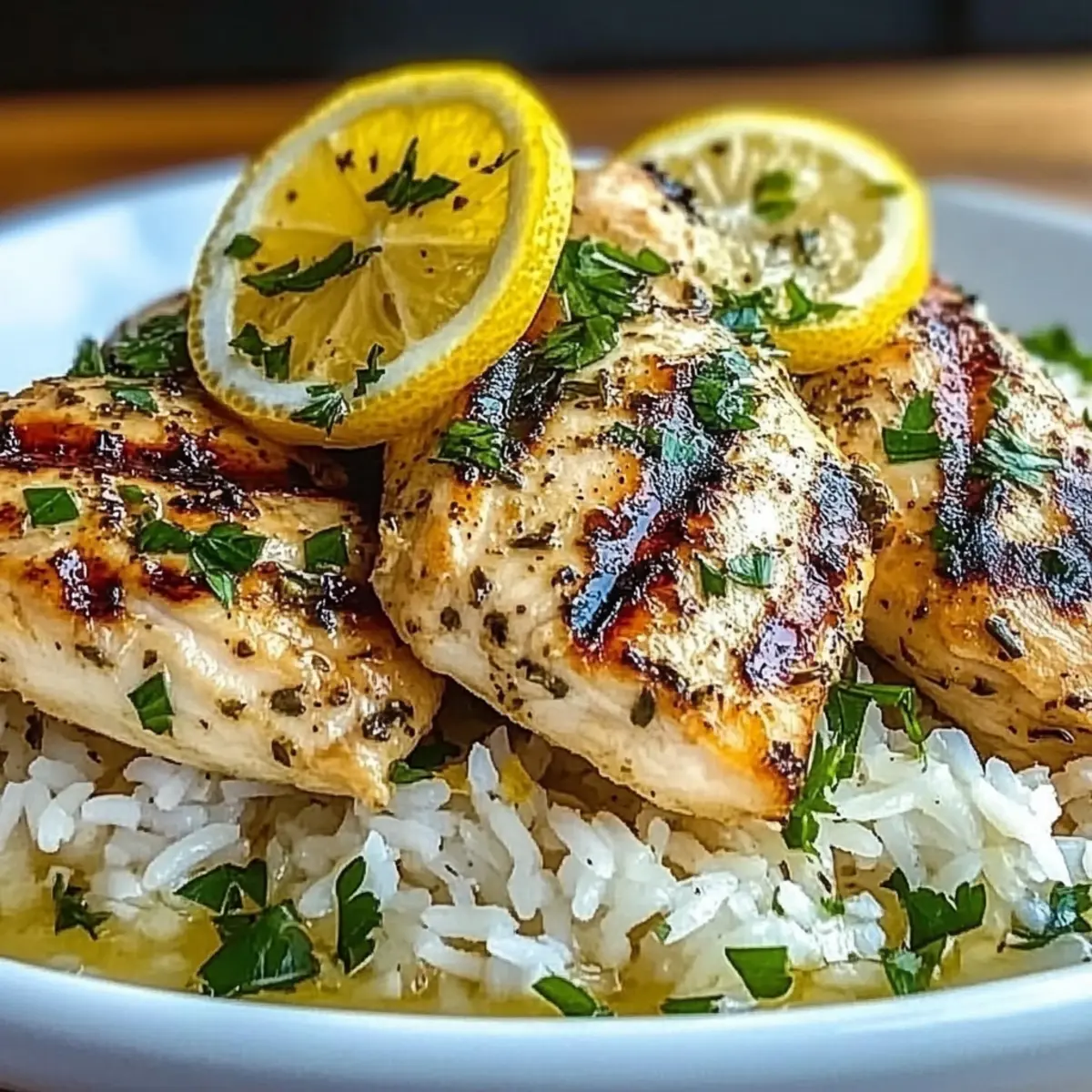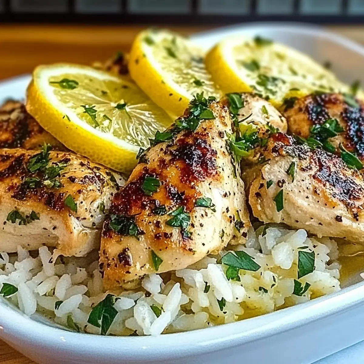 - Remove the chicken from the heat and let it rest for a few minutes. Serve the chicken on top of the rice, garnishing with lemon slices and fresh herbs if desired.