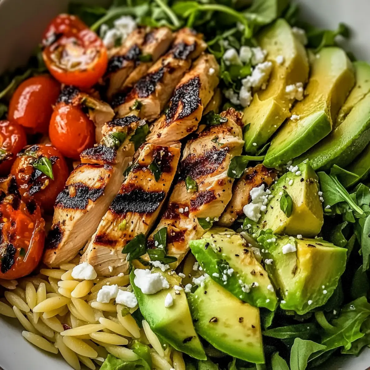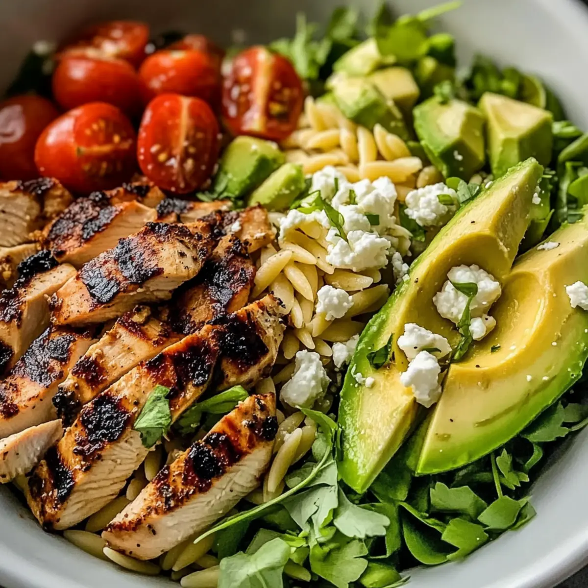 - In a large mixing bowl, combine cooked orzo, sliced chicken, diced avocado, halved cherry tomatoes, chopped red onion, crumbled feta, and fresh herbs. Toss gently.