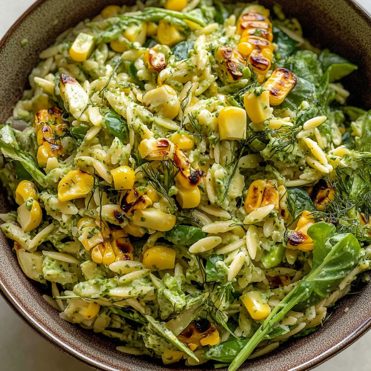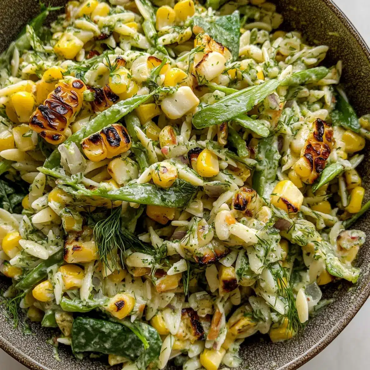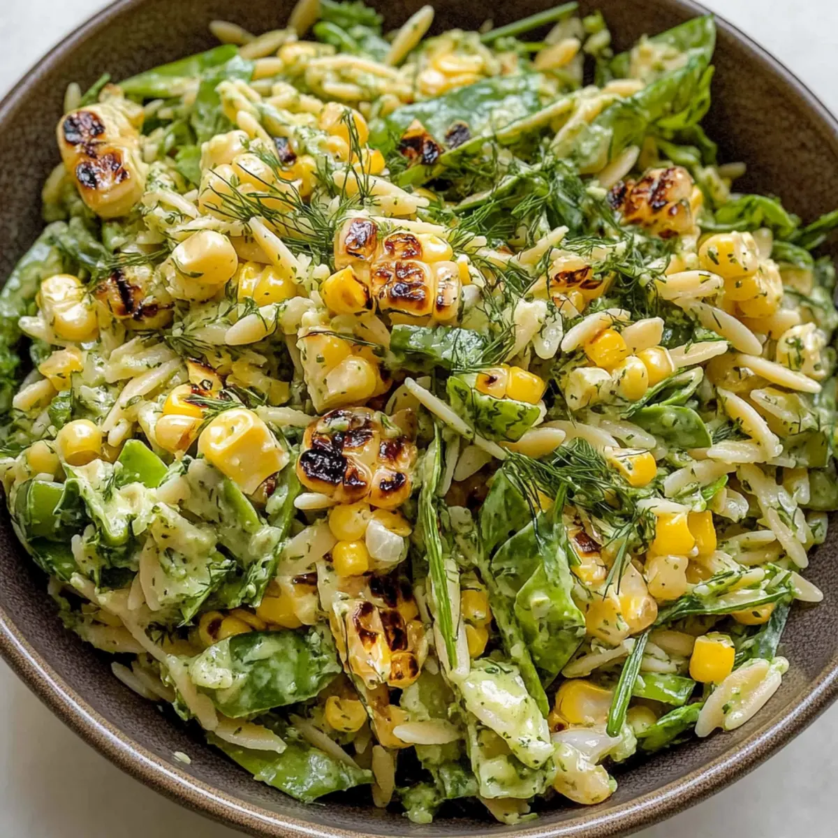 Vibrant Flavors: The Grilled Corn Orzo Salad bursts with the sweetness of charred corn paired with the aromatic freshness of dill.