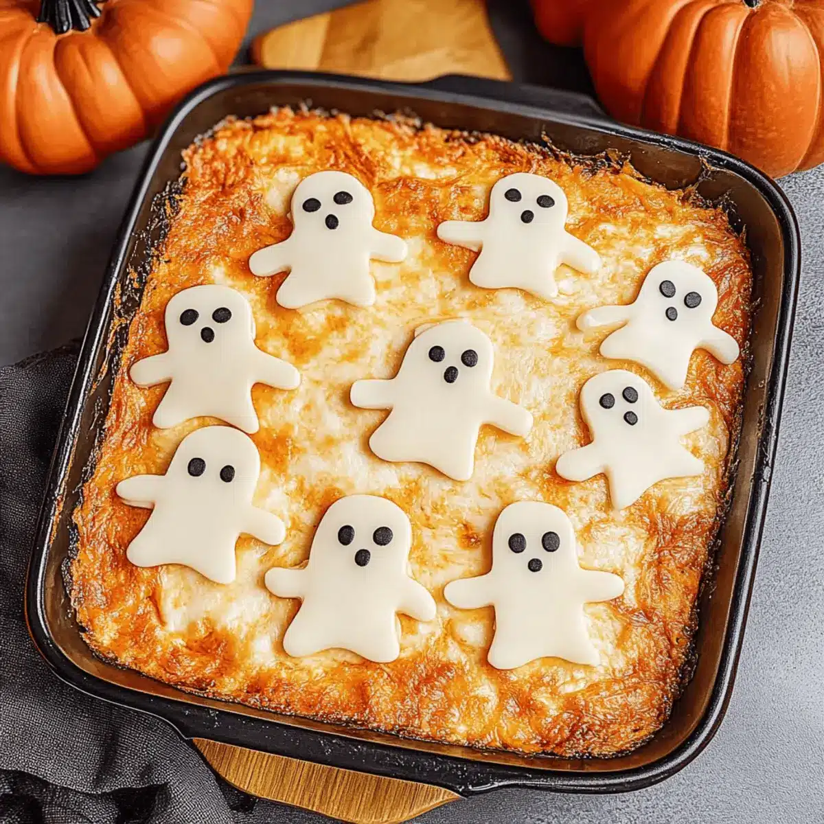 Using a ghost-shaped cookie cutter, cut out shapes from the white cheese slices. Arrange these adorable cheese ghosts atop the dip, creating a fun Halloween presentation. If you don’t have a cookie cutter, freehanding the shapes with a knife works just as well. This playful element captures the spirit of Halloween in your dip.