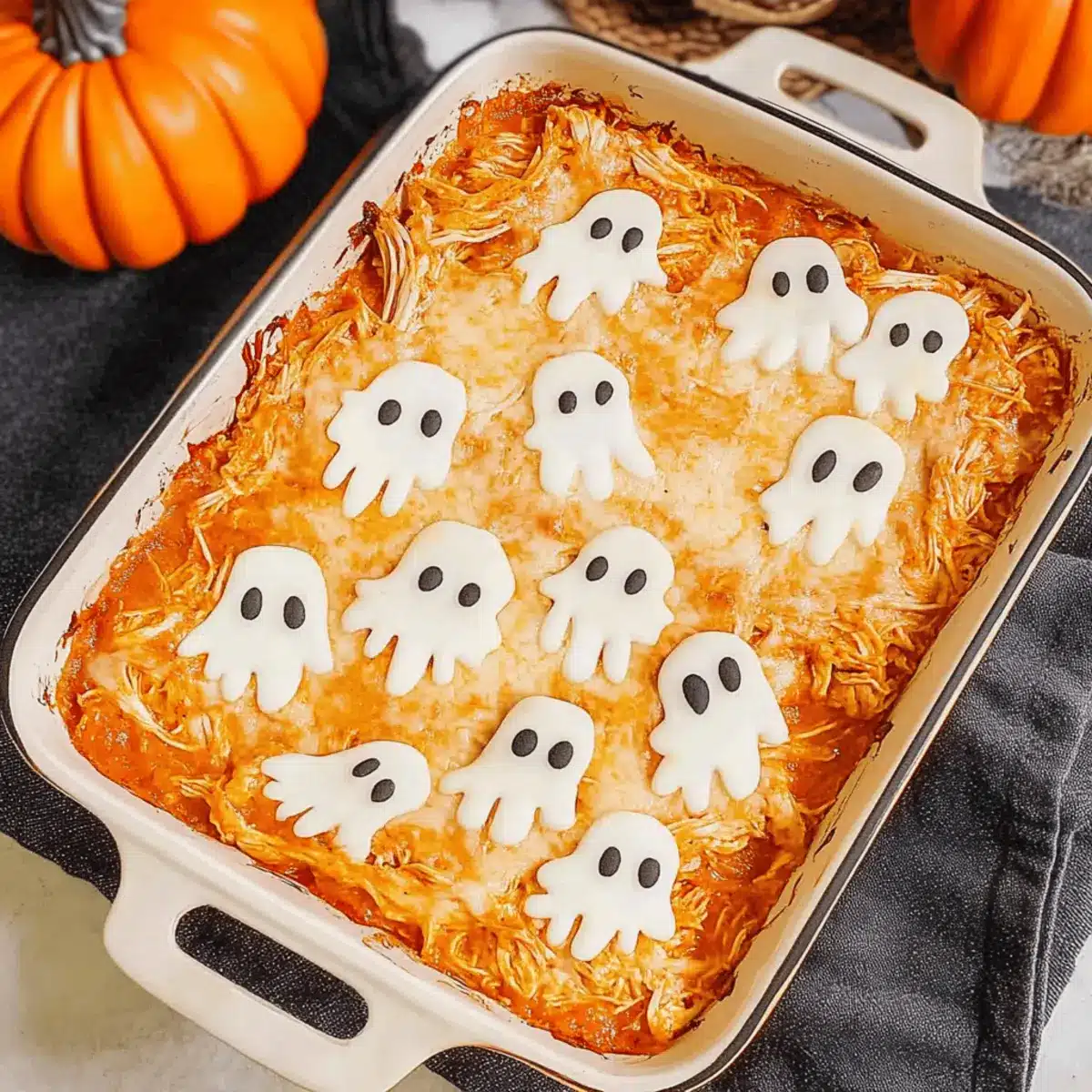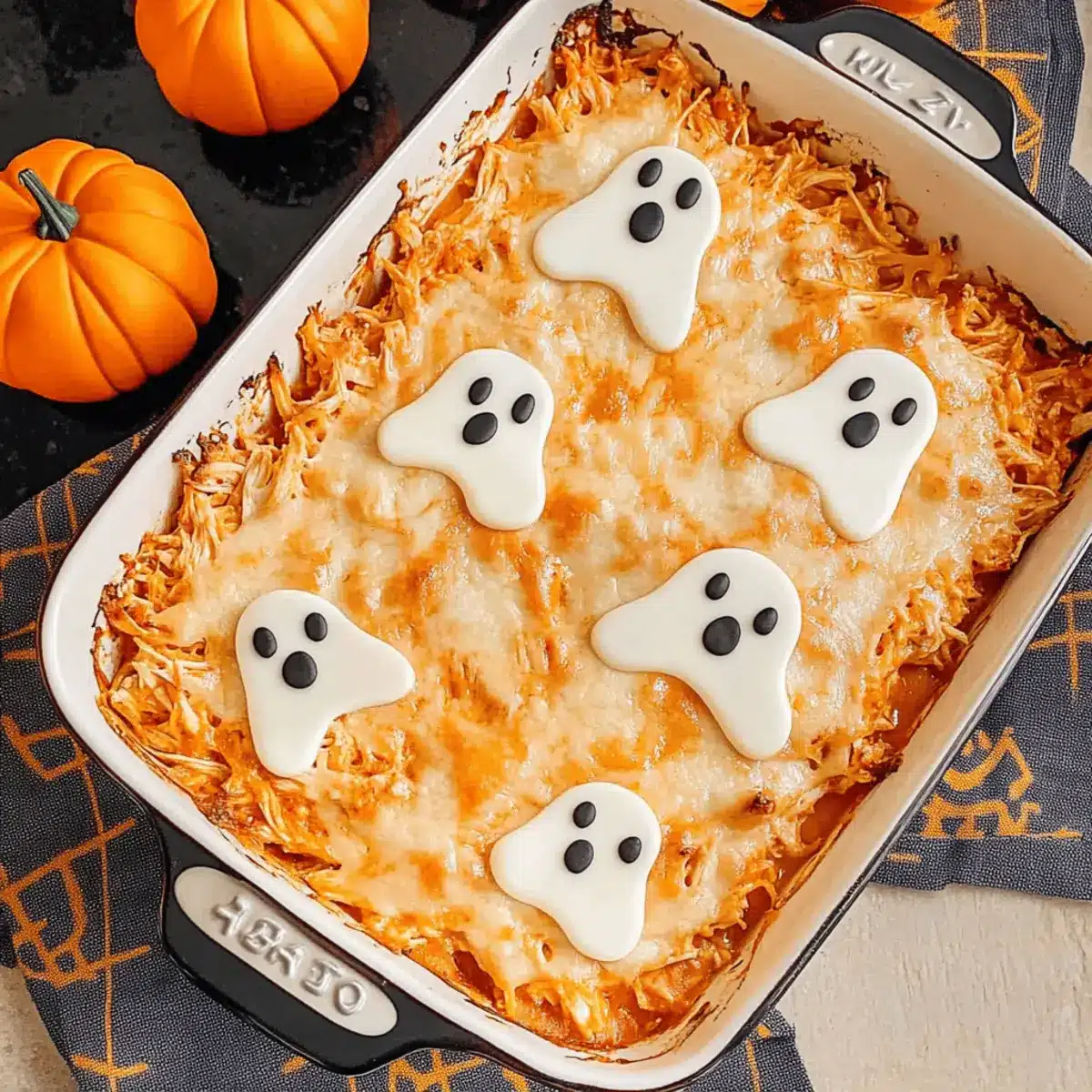 These Halloween Buffalo Chicken Dip preparations are perfect for busy cooks wanting to save time on the spooky night! You can prepare the dip base (cream cheese, shredded chicken, buffalo sauce, and ranch dressing) up to 24 hours in advance. Simply assemble the layers in the baking dish, cover tightly with plastic wrap, and refrigerate. The cheese ghosts can also be cut and stored separately in an airtight container to maintain freshness. When you’re ready to serve, just pop it in the preheated oven and bake for 15-20 minutes. This way, you’ll enjoy that just-as-delicious dip without the last-minute rush, allowing more time for fun Halloween festivities!