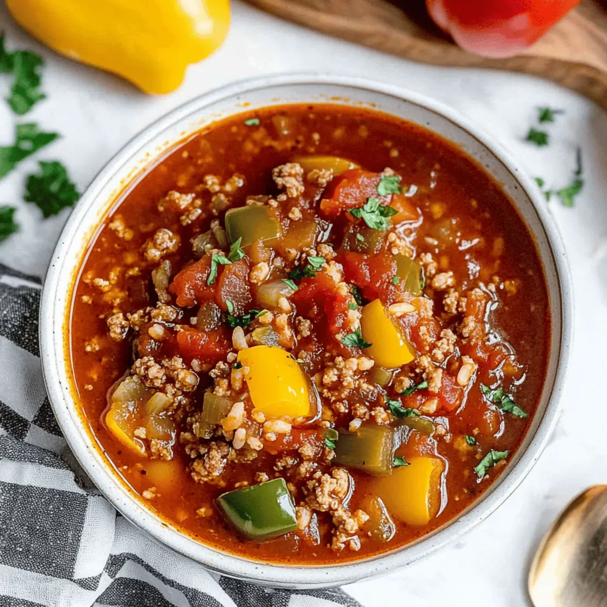 These Healthy Crock Pot Stuffed Pepper Soup preparations are a game-changer for busy home cooks! You can brown the ground beef, sauté the vegetables, and combine them in your slow cooker up to 24 hours in advance. Simply refrigerate the mixture overnight to maintain freshness. This way, the rich flavors meld beautifully and save you precious time. When you’re ready to enjoy, just add the broth, sauces, rice, and spices, then set your slow cooker to low for 6–8 hours or high for 3–4 hours. This ensures a deliciously warm meal with minimal effort on your part, making it perfect for those hectic weeknights!