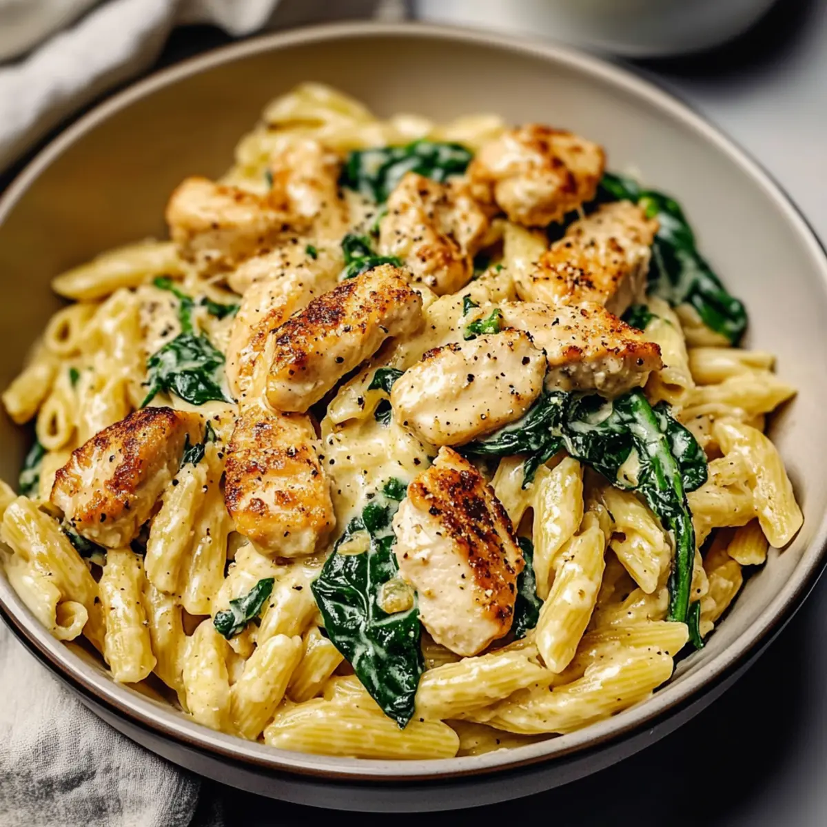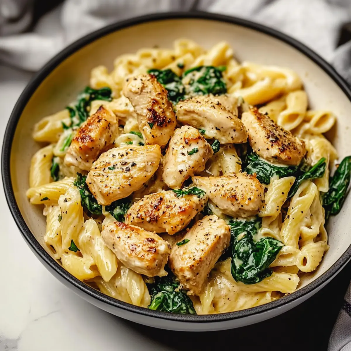 - Add the cooked chicken back to the skillet with the drained pasta and spinach, tossing to coat in the sauce.