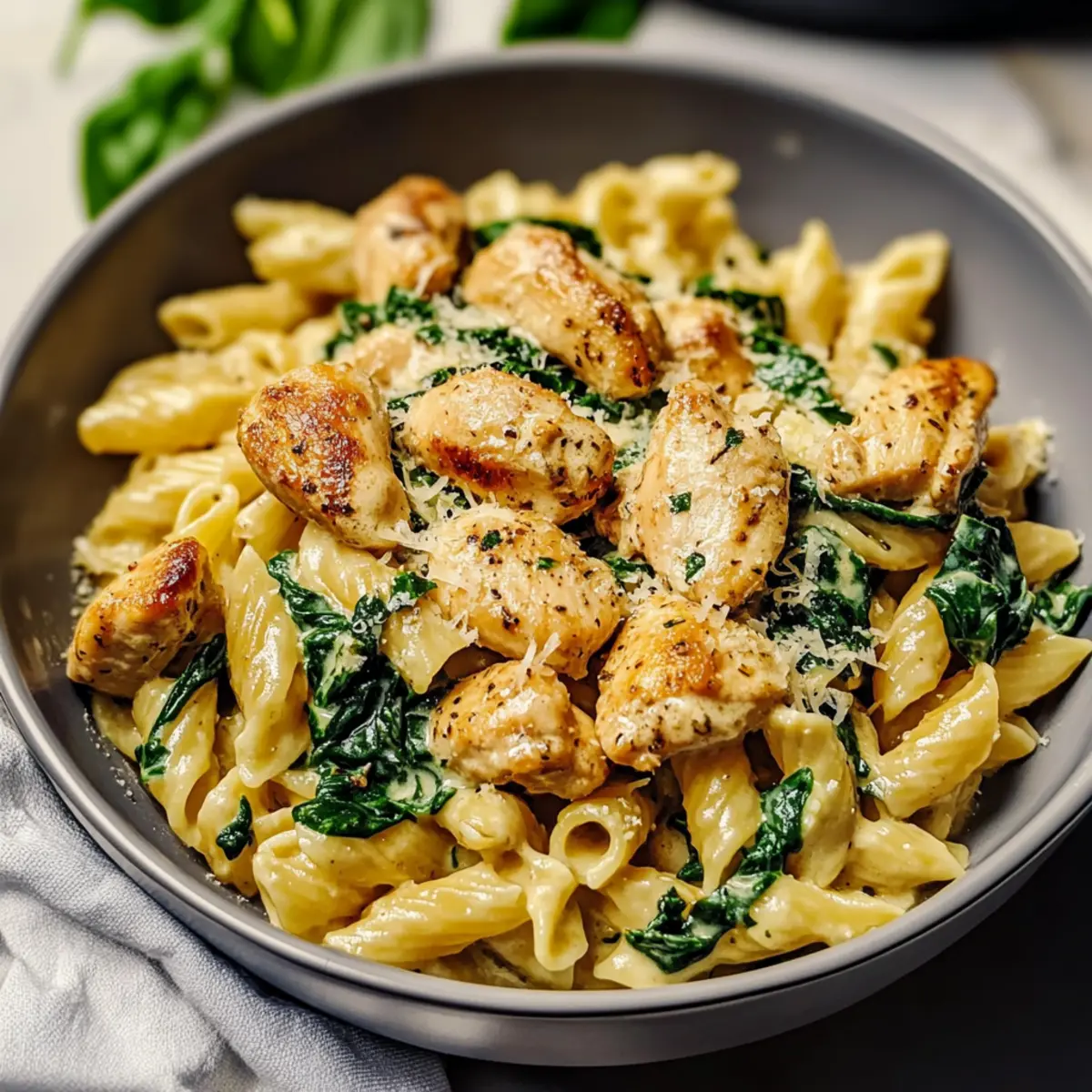 Return the cooked chicken to the skillet, and add the drained pasta along with a handful of baby spinach if using. Toss everything together, ensuring that the pasta is thoroughly coated in the creamy garlic Parmesan sauce and that the spinach wilts down into a vibrant green.