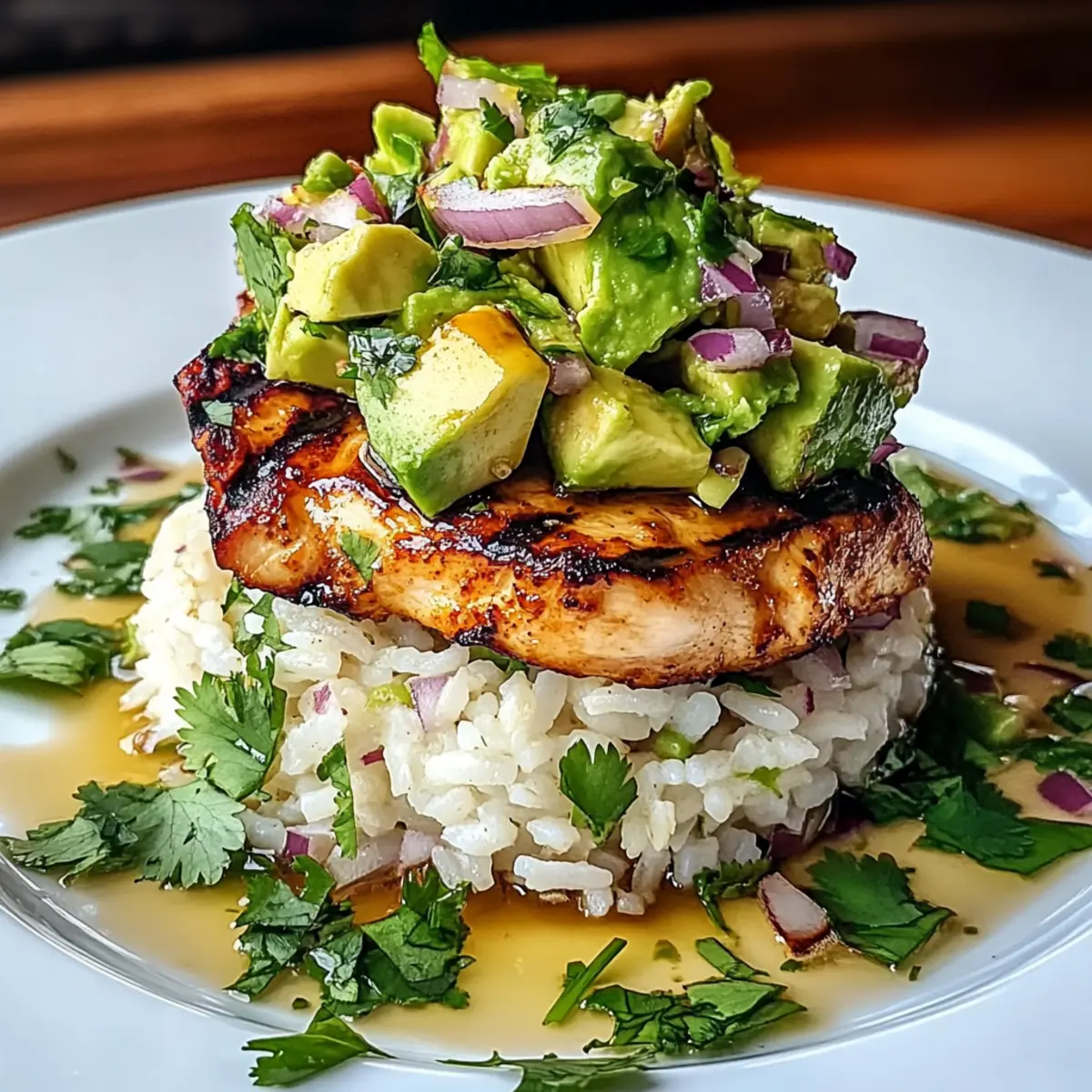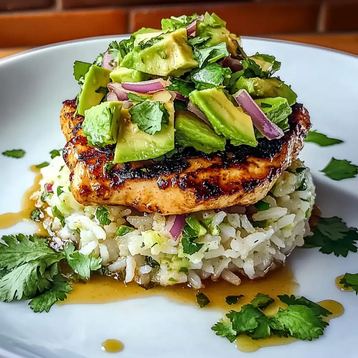 - Assemble the stack by layering jasmine rice on the bottom, placing sliced grilled chicken on top, and spooning the avocado mixture over.