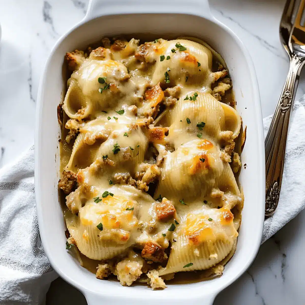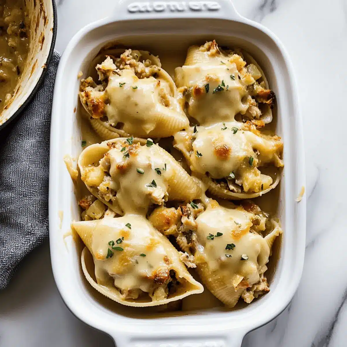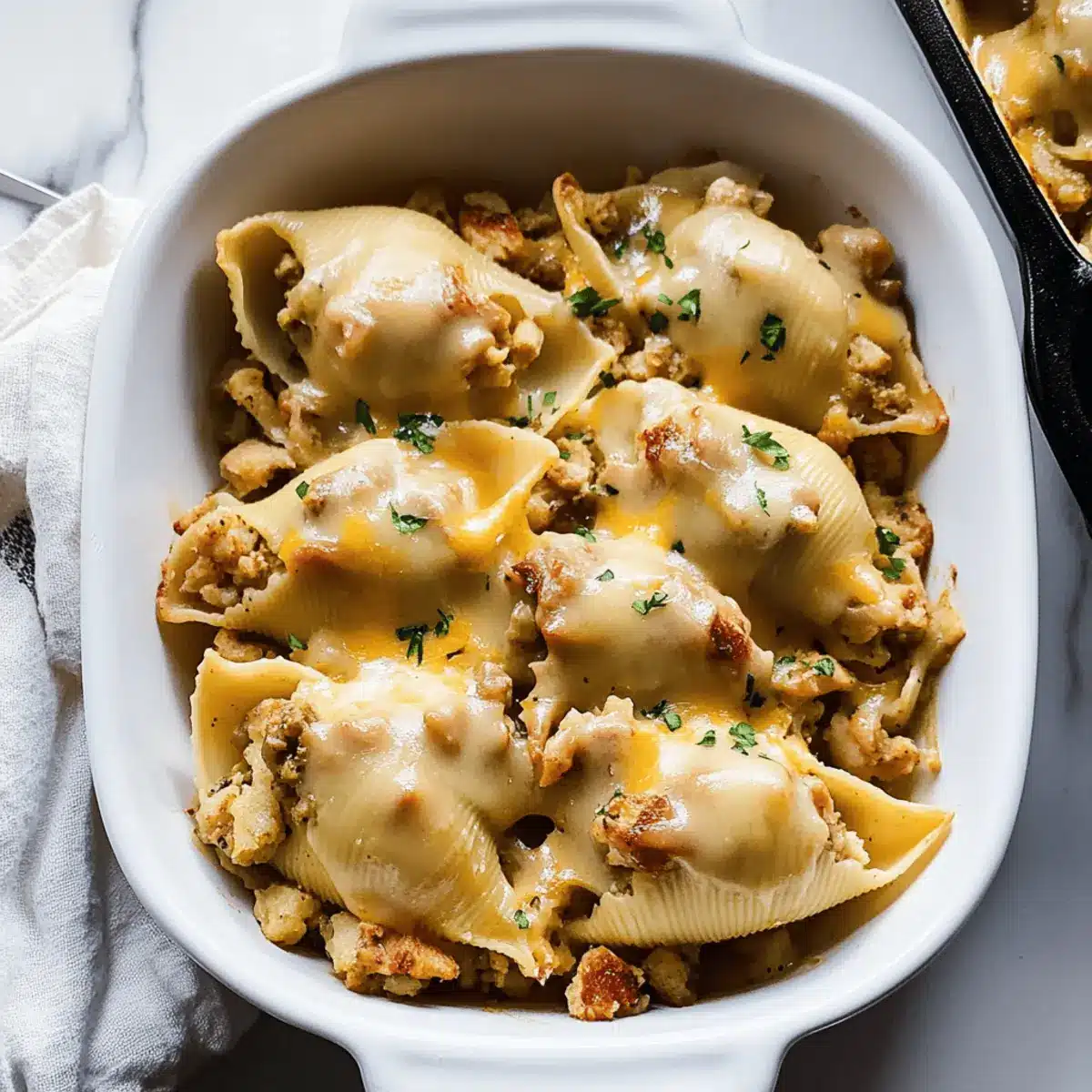 Once all the shells are nicely arranged, drizzle any remaining gravy over the top, followed by the rest of the shredded cheese and any leftover stuffing. Bake in your preheated oven for 25-30 minutes, or until the cheese is bubbly and slightly golden, creating a delightful layer of melty goodness.
