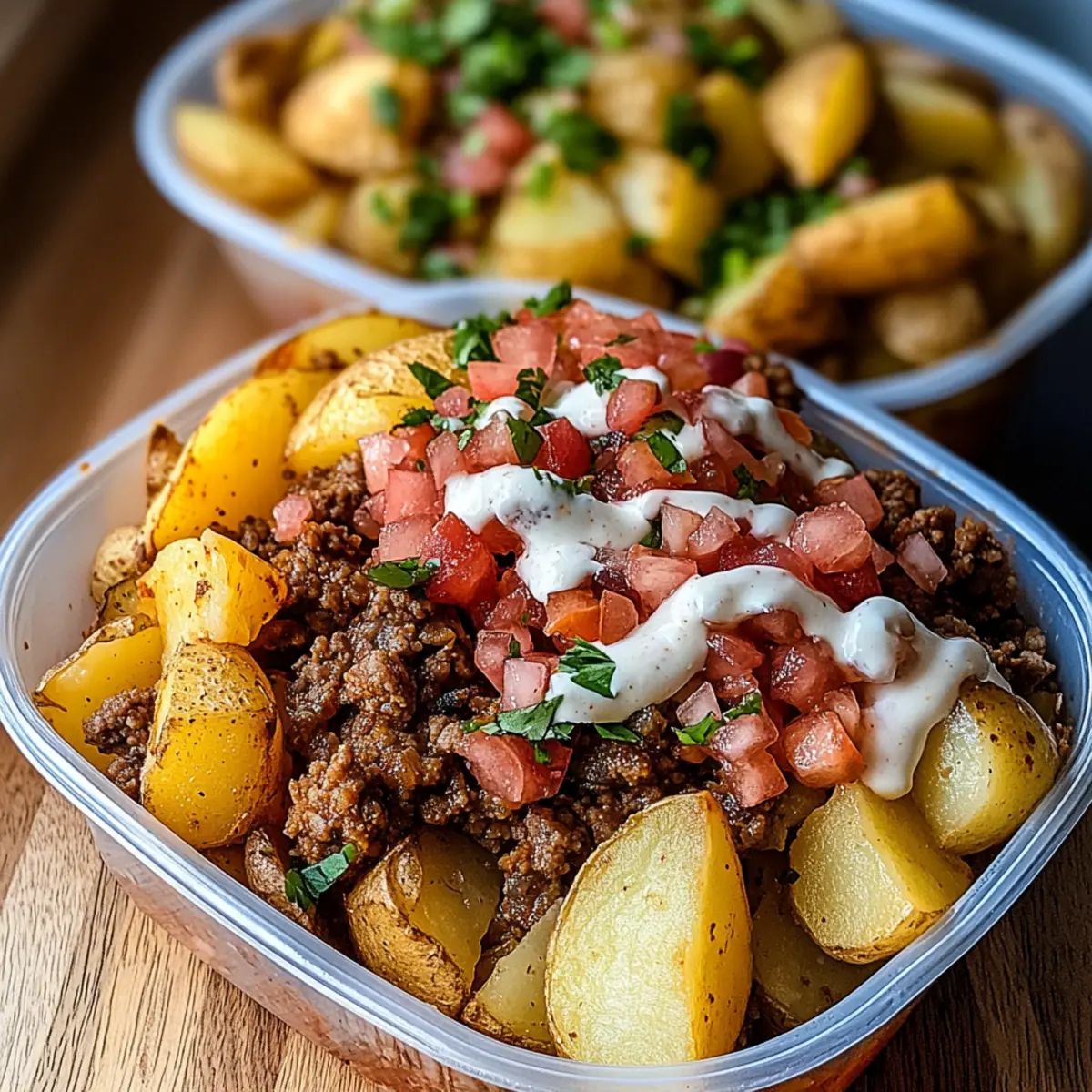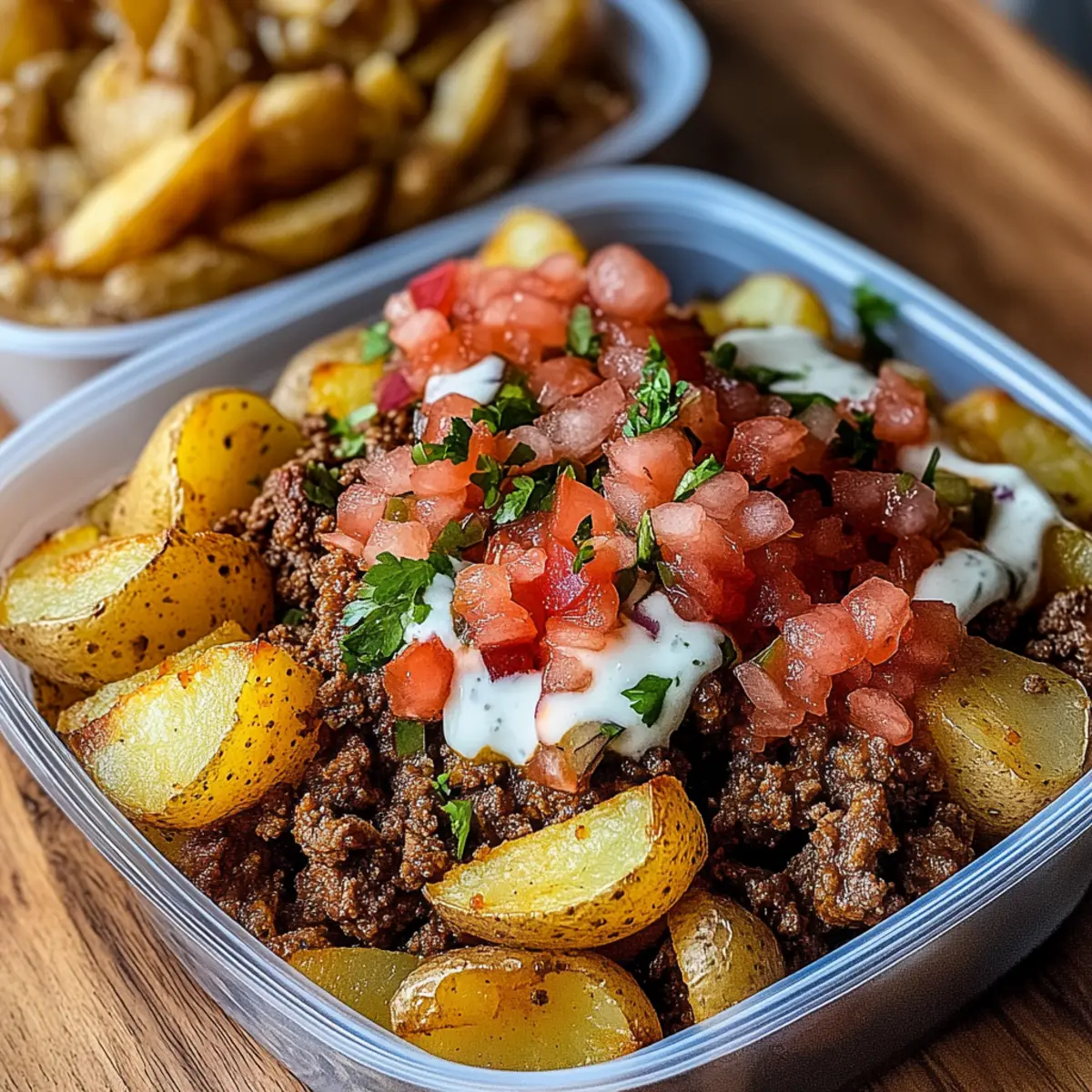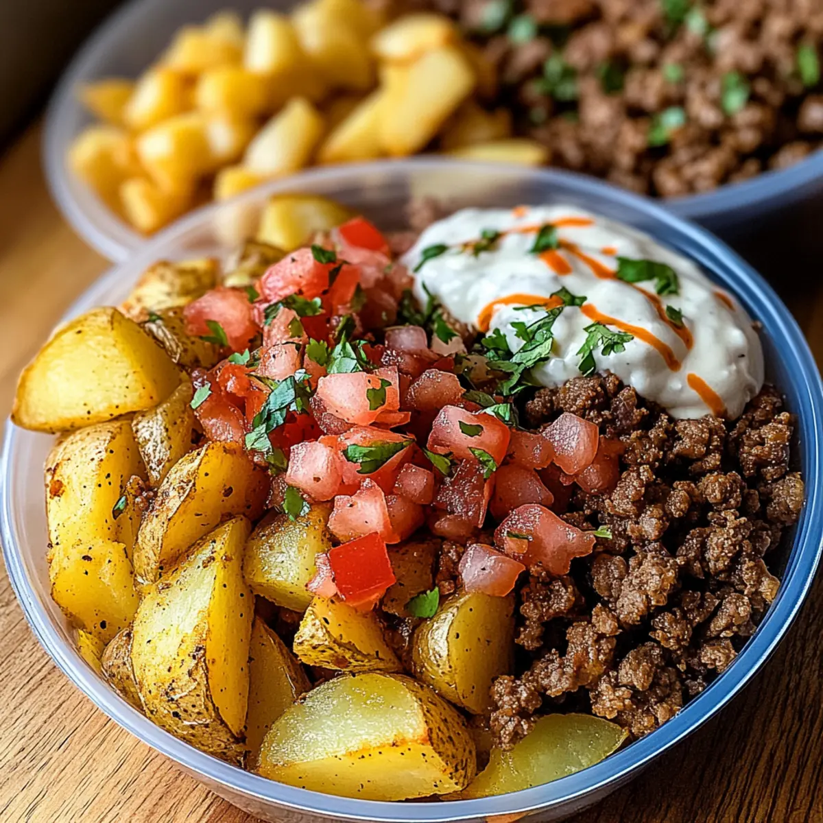 Once the potatoes are roasted and your taco meat is ready, it’s time to assemble your Loaded Potato Taco Bowls. In meal prep containers, start with a base of crispy potatoes, followed by a generous scoop of seasoned taco meat. Top with the fresh pico de gallo and finish with a drizzle of your homemade sriracha mayo for a delightful, flavor-packed meal!