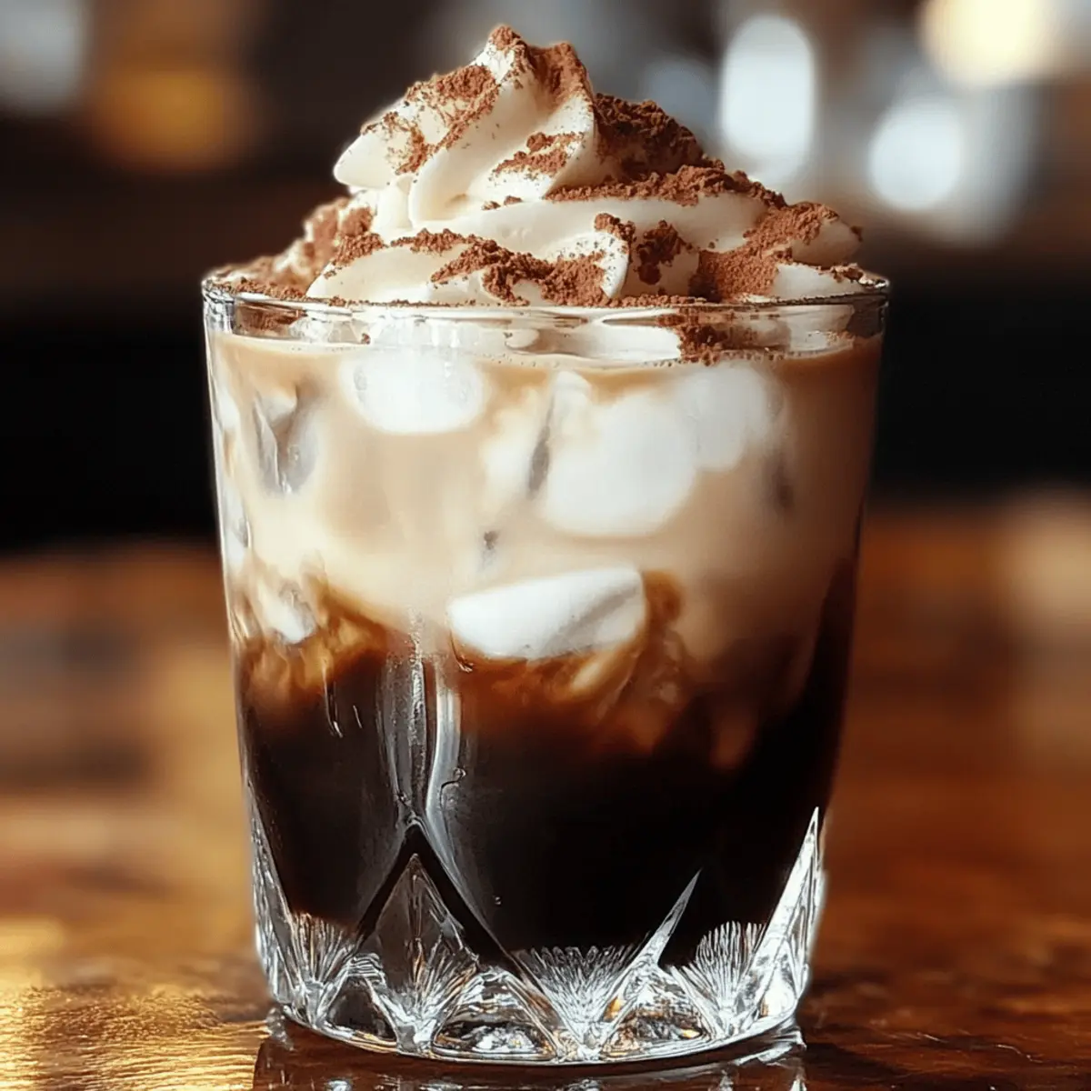 Strain the blended mixture into a tall glass filled with fresh ice, ensuring a smooth pour that filters out any ice or debris. The resulting drink should have a rich, dark color, indicating the robust flavors of coffee and spirits. This presentation sets the stage for a delightful experience.
