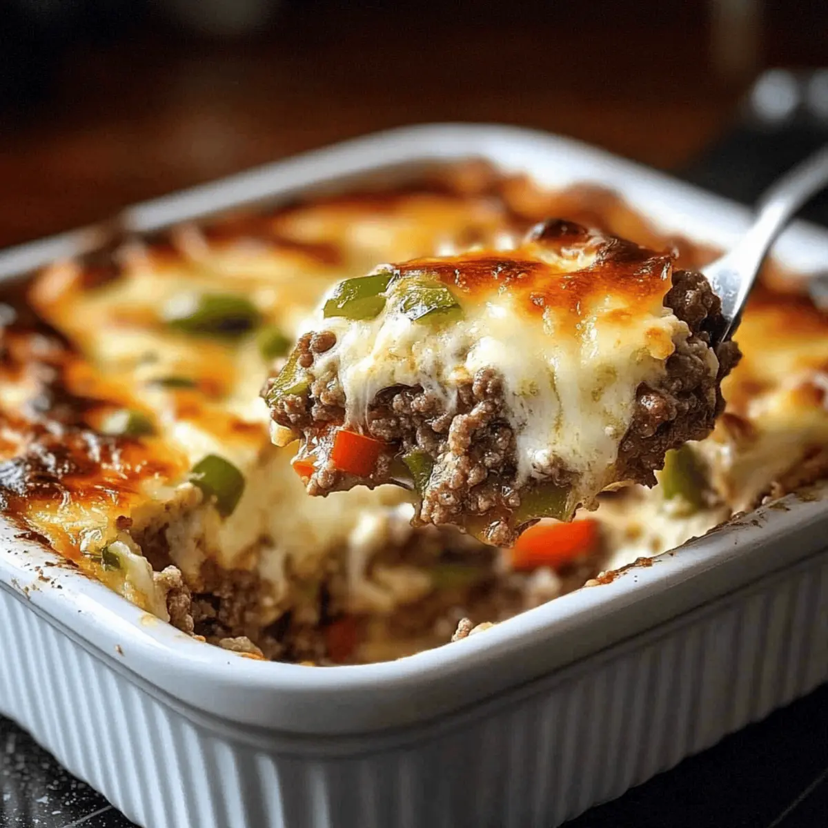 These Low Carb Philly Cheesesteak Casserole preparations are perfect for meal prep enthusiasts looking to save time during hectic weeknights! You can sauté the vegetables and cook the ground beef up to 24 hours in advance; simply store them in an airtight container in the refrigerator. Additionally, you can assemble the entire casserole without baking it, covering it tightly and refrigerating for up to 3 days. To maintain quality and avoid sogginess, ensure the beef mixture cools completely before assembling. When you’re ready to serve, simply bake the casserole at 350°F (175°C) for 25-30 minutes until heated through and the cheese is bubbly. Enjoy your delicious, stress-free meal with minimal effort!
