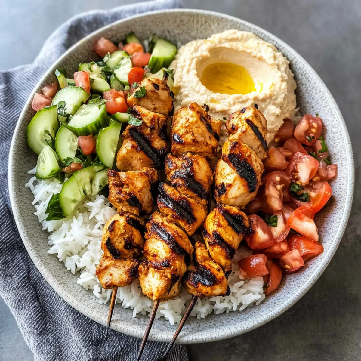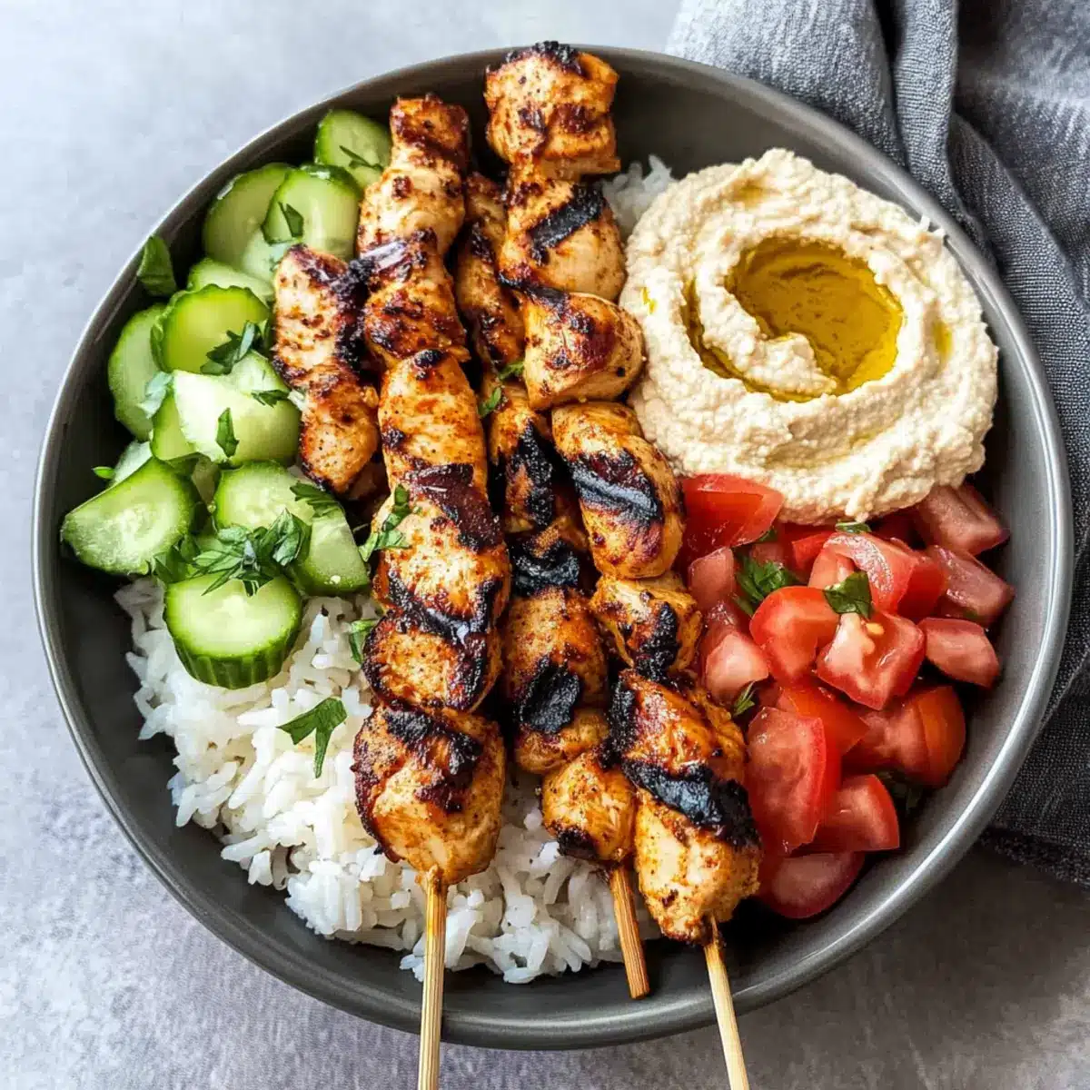 To assemble your Mediterranean rice bowl, start by dividing the fluffy rice pilaf among your serving bowls. Lay the grilled chicken tawook skewers atop the rice, then spoon a generous serving of the cucumber-tomato salad beside it. Finish with a dollop of creamy hummus and serve with warm pita or naan on the side. The Mediterranean Rice Bowl with Grilled Chicken Tawook Skewers is ready to enjoy!