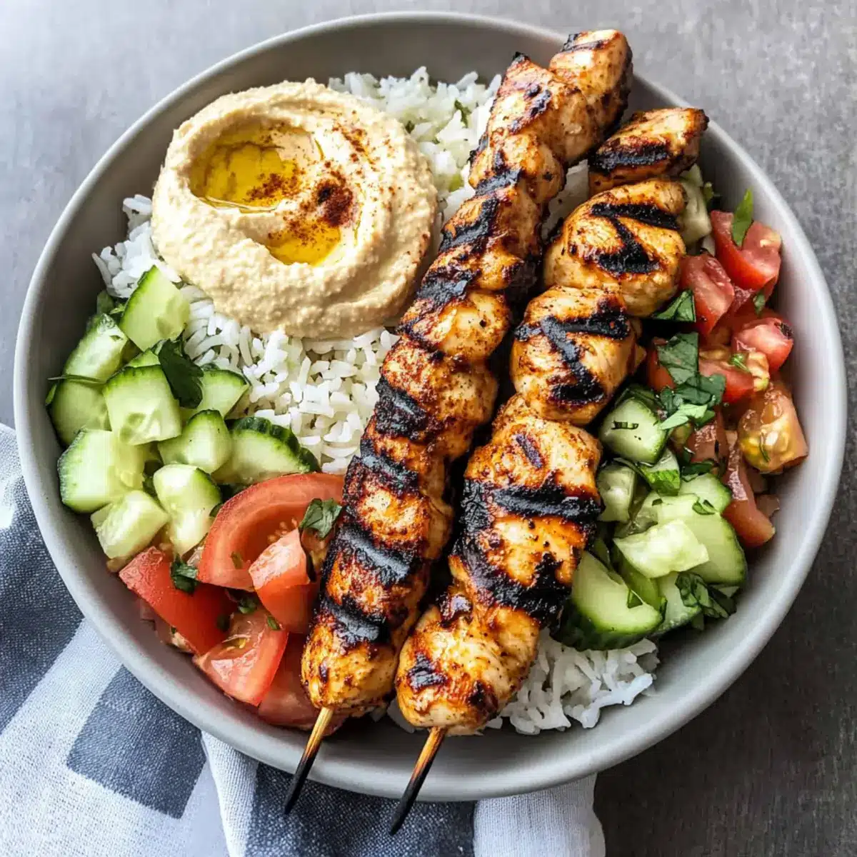 Mediterranean Rice Bowl with Grilled Chicken Tawook Skewers Delight