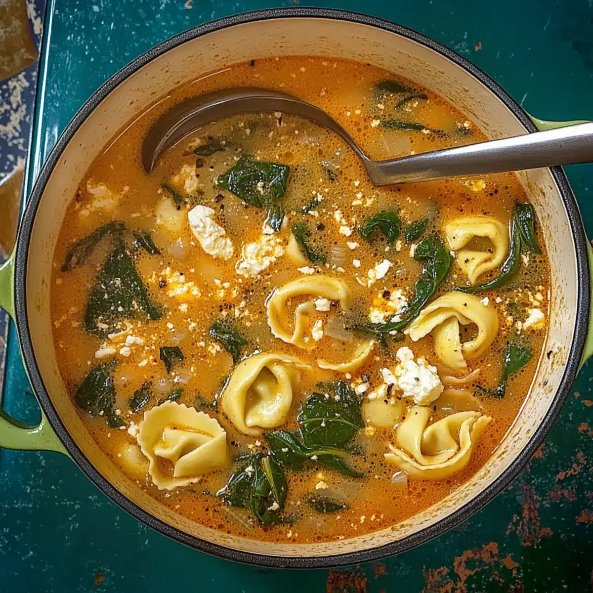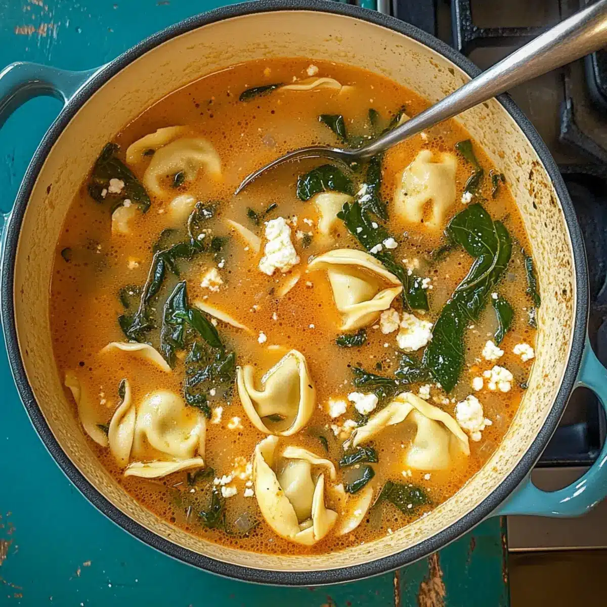 After the tortellini is cooked, lower the heat to a simmer and add 4 cups of fresh spinach, 1 cup of crumbled feta cheese, and ½ cup of heavy whipping cream. Allow it to simmer for an additional 5 minutes, stirring gently. The spinach will wilt beautifully, and the feta will become creamy, enriching the Mediterranean Tortellini Soup.