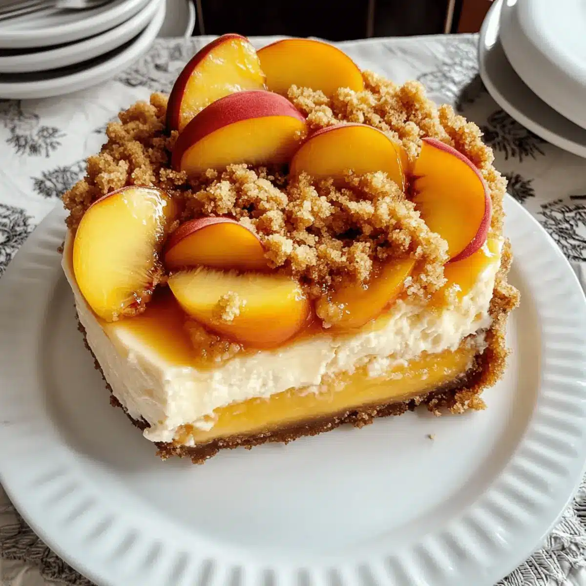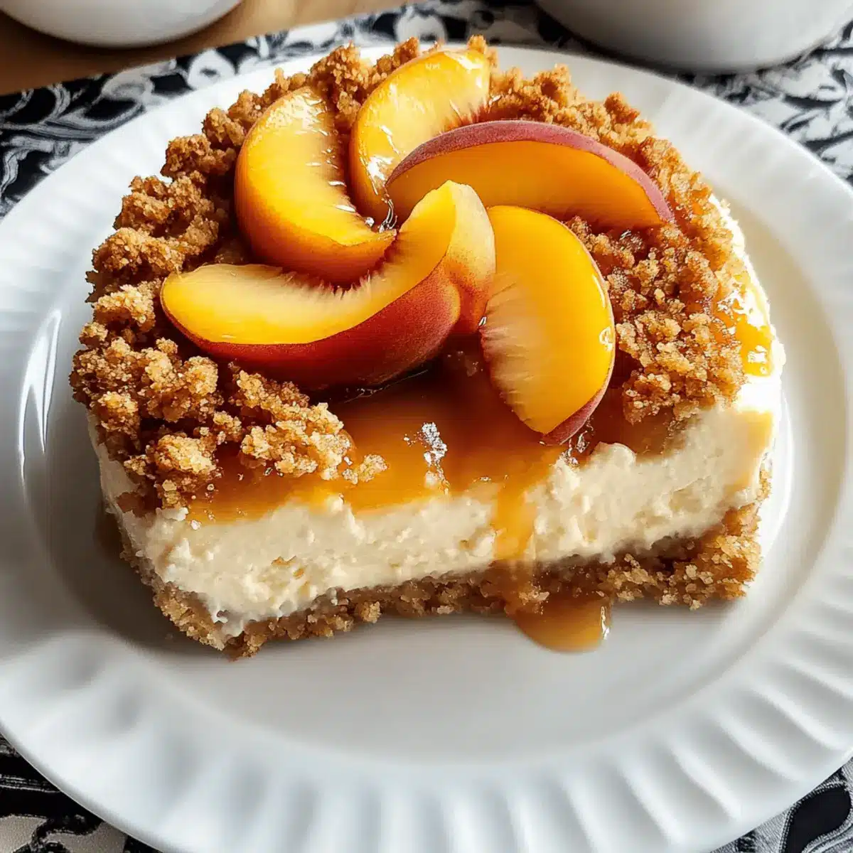 - Spoon the peach mixture over the cheesecake filling, spreading evenly. Sprinkle the crumble topping over the peaches.