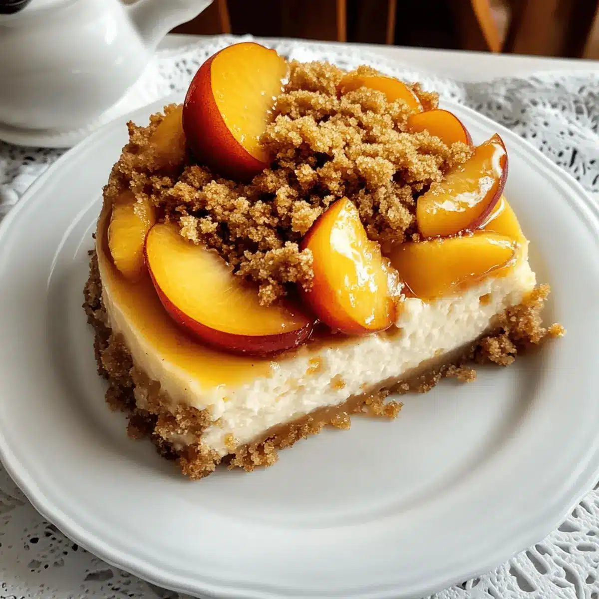 In a saucepan over medium heat, combine peach slices, granulated sugar, cornstarch, cinnamon, nutmeg, and lemon juice. Cook until the mixture bubbles gently and the peaches soften, around 5–7 minutes. Remove from heat and allow it to cool slightly; this topping adds that delightful fruity layer to your cheesecake.