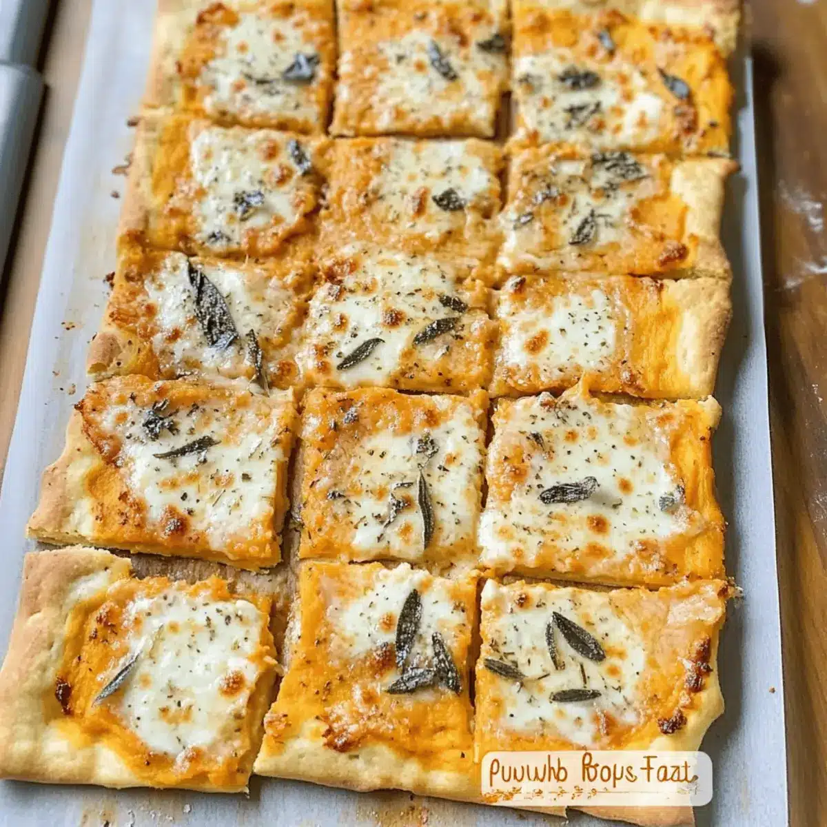 Sprinkle the finely shredded mozzarella cheese generously over the pumpkin-ricotta layer, followed by the freshly chopped sage. The mozzarella will melt beautifully in the oven, while the sage adds a lovely herbal note to your flatbread, making it aromatic and irresistible.