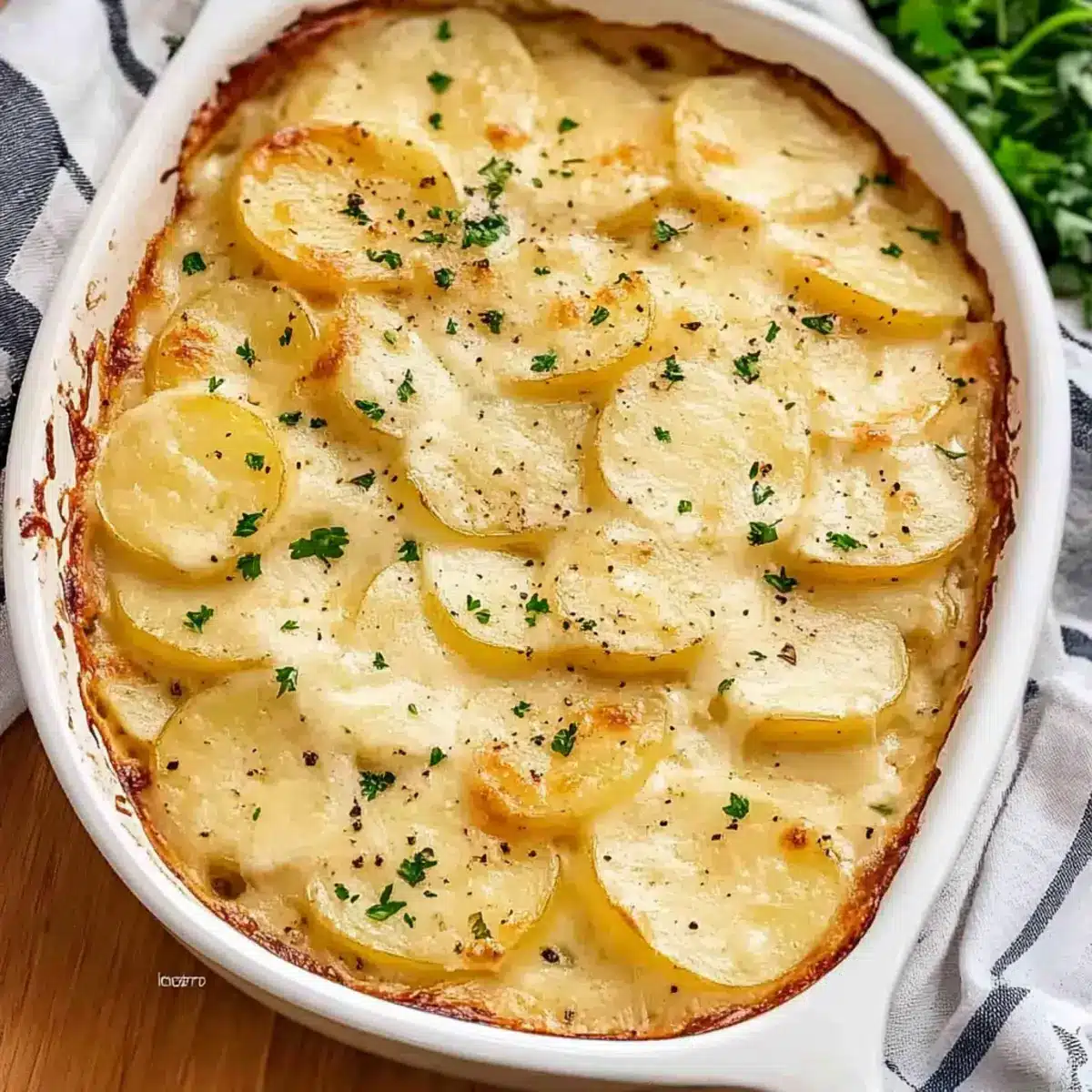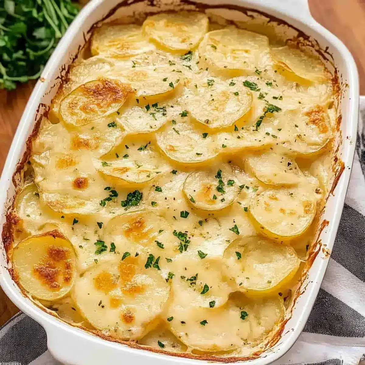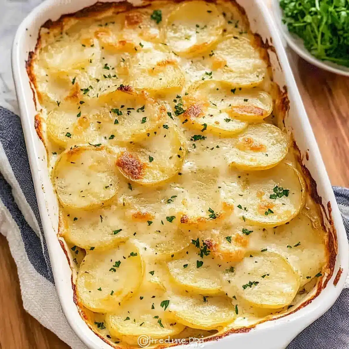 Savory Crunch: Sprinkle crispy bacon or diced ham between the layers for added protein and flavor. The salty bites will complement the creamy potatoes perfectly, providing that savory contrast so many love.
