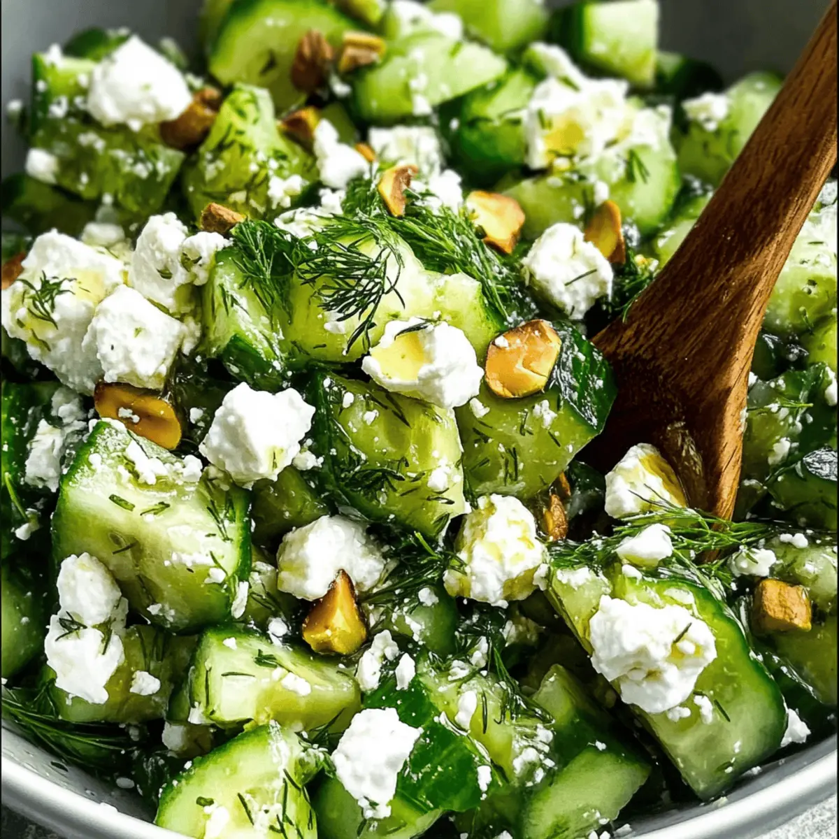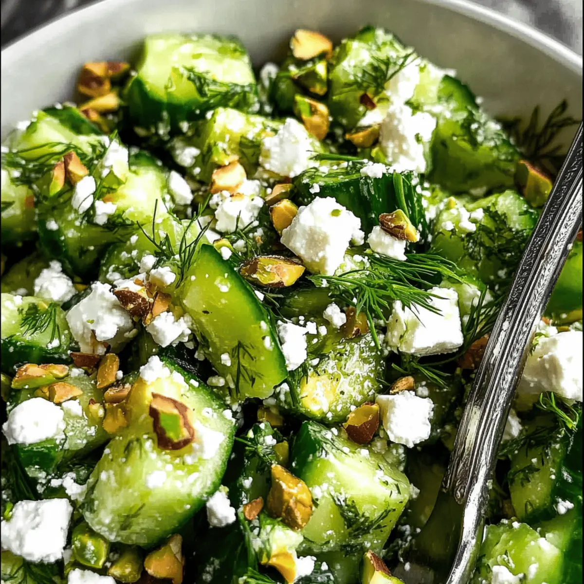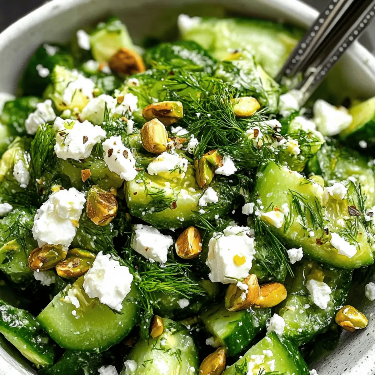 - Add diced avocado, chopped pistachios, fresh dill, chives, and crumbled feta to the bowl with cucumbers. Gently toss until well mixed.