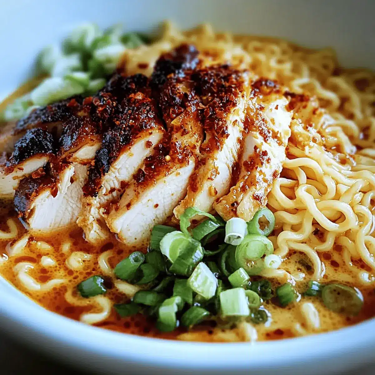 Preparing your Spicy Fiery Chicken Ramen with Creamy Garlic Sauce in advance is a game changer for busy weeknights! You can marinate the chicken (or tofu) up to 24 hours ahead of time to deepen the flavor. Additionally, the creamy garlic sauce can be prepared in advance and stored in the refrigerator for up to 3 days; just be sure to reheat it gently to maintain the creamy texture. When you’re ready to serve, simply cook the ramen noodles and combine them with the sauce on the stovetop. Finish by topping with sliced chicken or tofu and garnish as instructed, ensuring a quick yet delicious meal with minimal effort!
