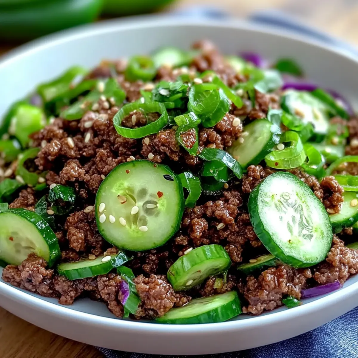 These Spicy Korean Ground Beef with Cucumber Salad are perfect for busy weeknights and meal prep enthusiasts! You can prepare the ground beef mixture up to 3 days in advance. Simply cook and cool the beef, then store it in an airtight container in the refrigerator. The cucumber salad can be prepped up to 24 hours ahead by slicing the cucumbers and tossing them with rice vinegar and salt—this helps them stay crisp. To maintain quality, keep the beef and salad separate until you’re ready to serve. When it’s time to enjoy, reheat the beef in a pan until warmed through, then plate with the fresh cucumber salad on top for a delightful, quick meal that’s just as delicious!