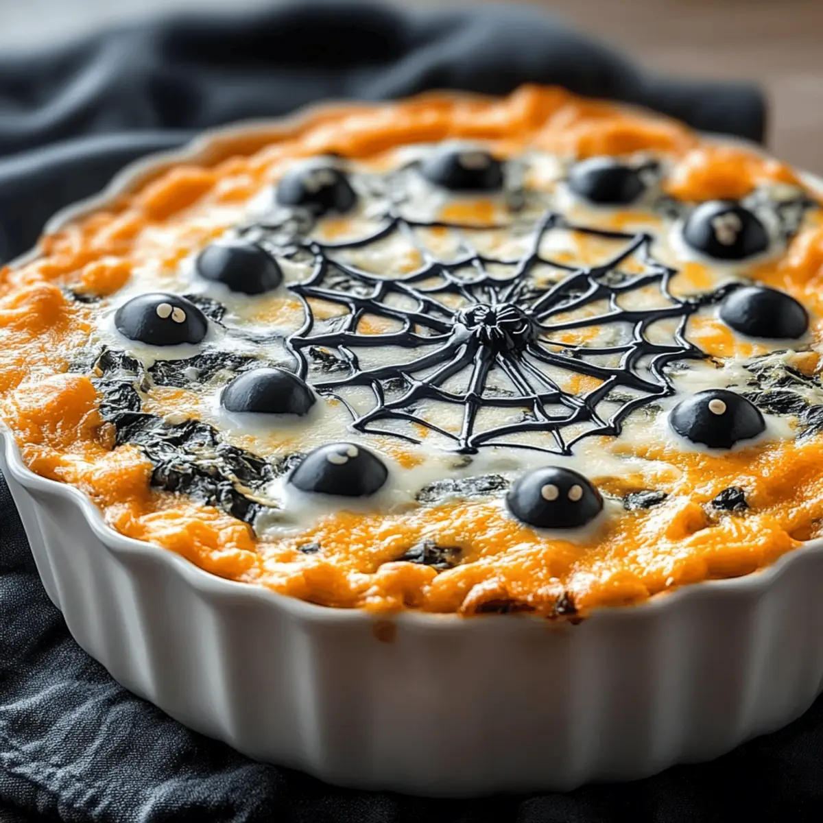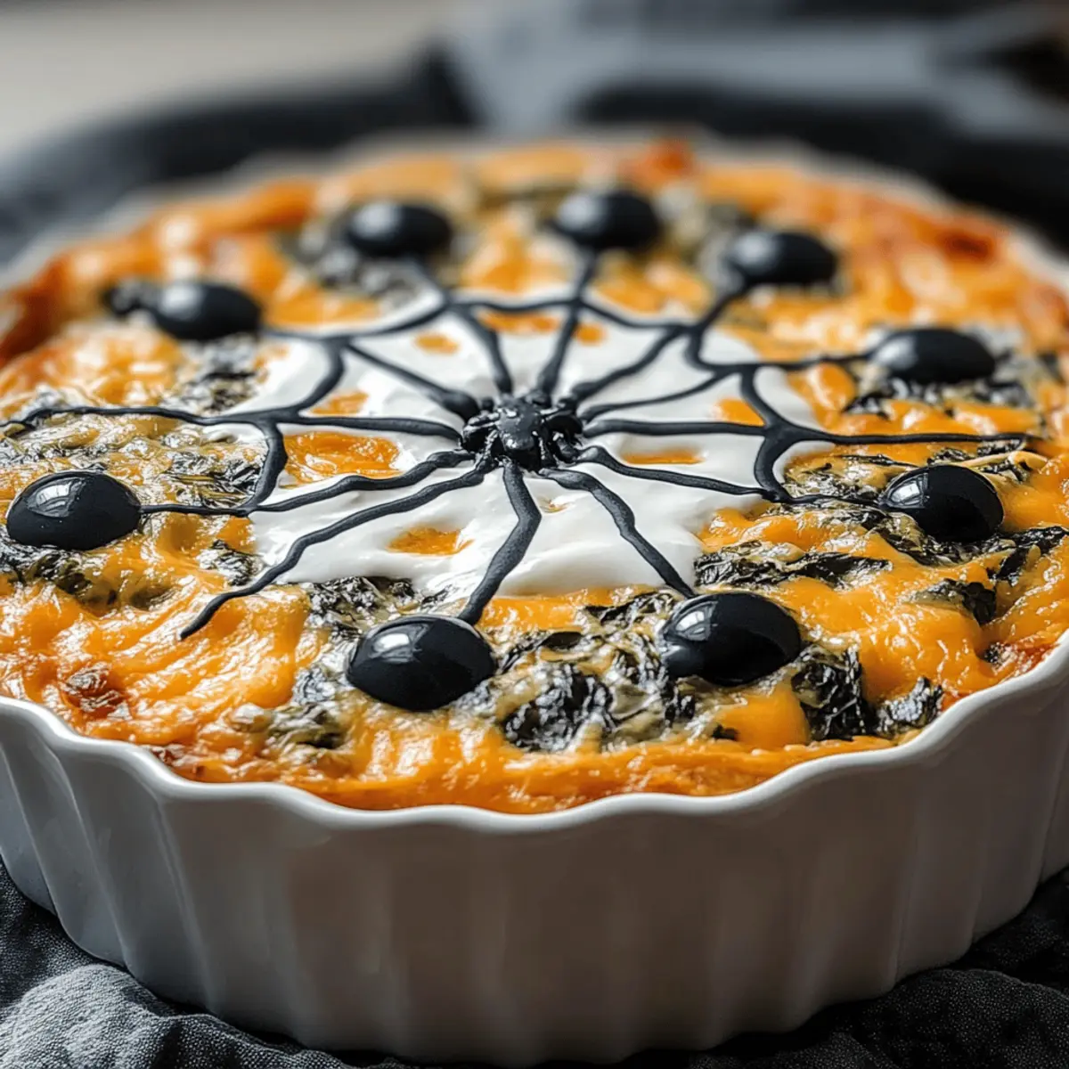 Once out of the oven, let your dip cool for a few minutes. Use a spoon to create swirling patterns with sour cream on the surface, resembling eerie spider webs. For added spookiness, place sliced olives strategically as spider eyes. Serve your Spooky Halloween Graveyard Spinach Dip with themed chips or fresh veggies, and watch it vanish in delight!