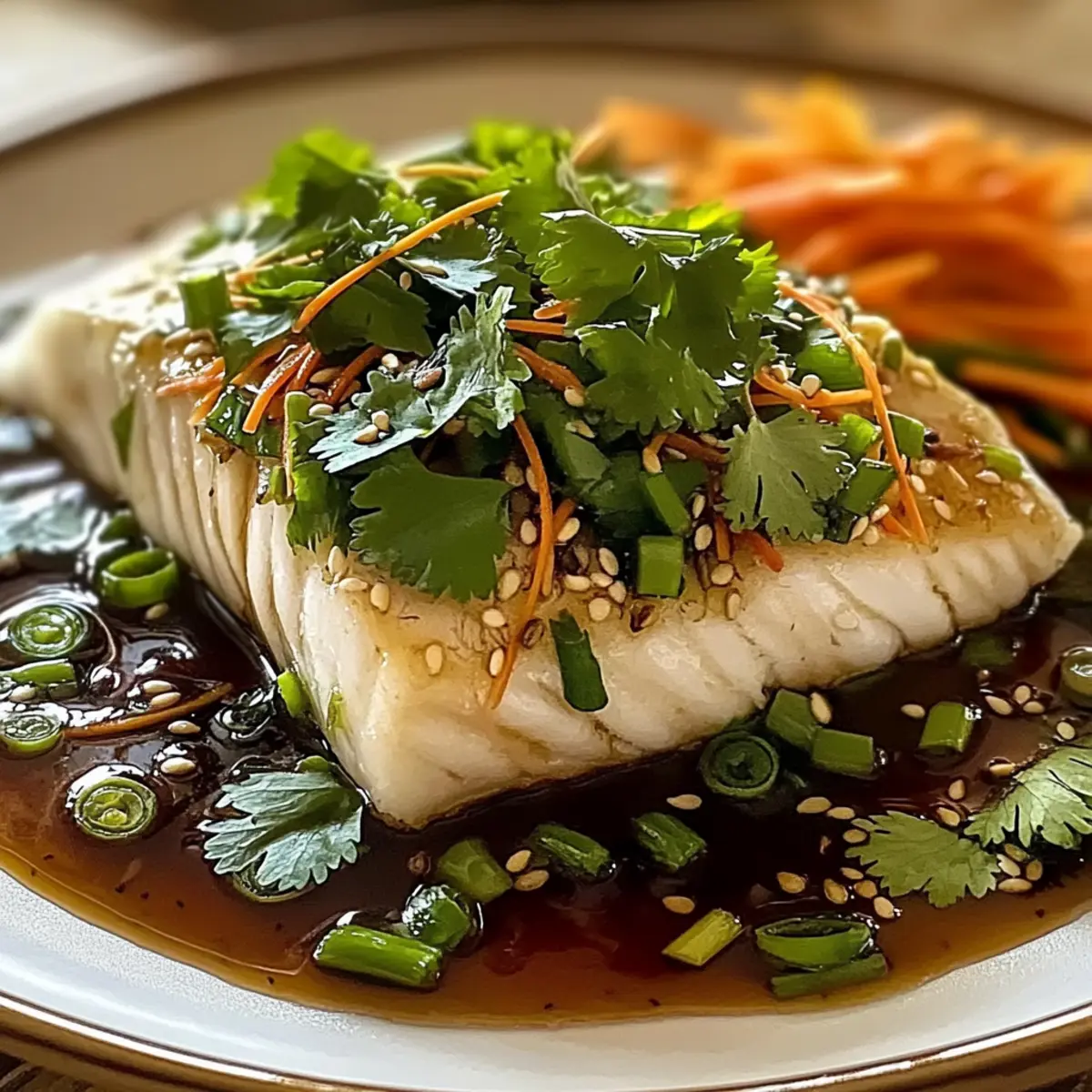 After steaming, carefully remove the plates from the steamer and top each fillet with the ginger-green onion mixture. For an extra layer of flavor, drizzle the prepared ginger-soy mixture over the fish and carrots. Serve immediately alongside fluffy rice or crisp vegetables for a complete and satisfying meal.