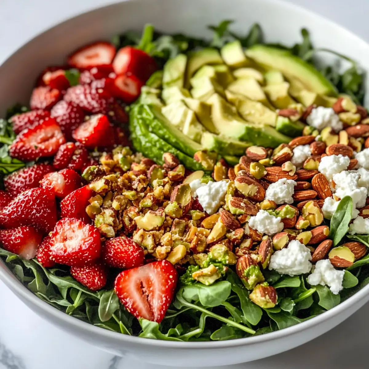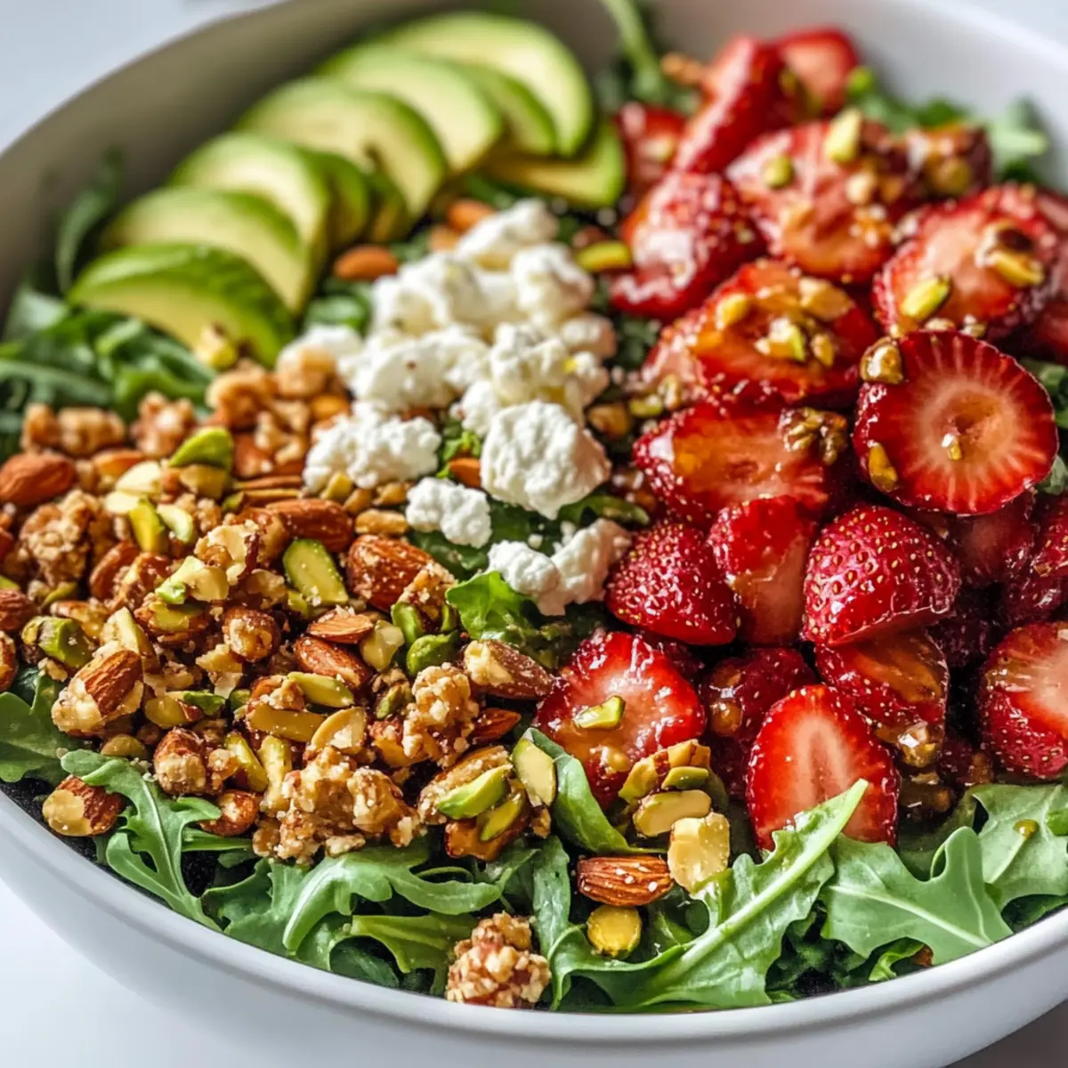 Once the salad base is ready, add in the sliced strawberries, diced ripe avocado, crumbled goat cheese, and chopped pistachios. Gently fold these ingredients together, combining textures and flavors while being careful not to mash the avocado, creating a delightful medley for your salad.