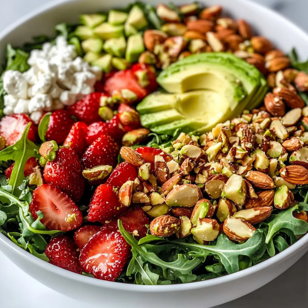 These Strawberry Crunch Salad components are perfect for meal prep! You can caramelize the almonds up to 3 days in advance and store them in an airtight container to maintain their crunch. Also, wash and dry the arugula, and refrigerate it for 24 hours ahead of time to preserve freshness. Prepare the dressing in advance, keeping it in the fridge for up to 3 days; just give it a good shake before using. To prevent the avocado from browning, slice it just before serving and toss it with a bit of lemon juice. When ready to serve, simply combine all the prepped ingredients, dress your salad, and enjoy this vibrant dish that saves you time while keeping all the delightful flavors intact!