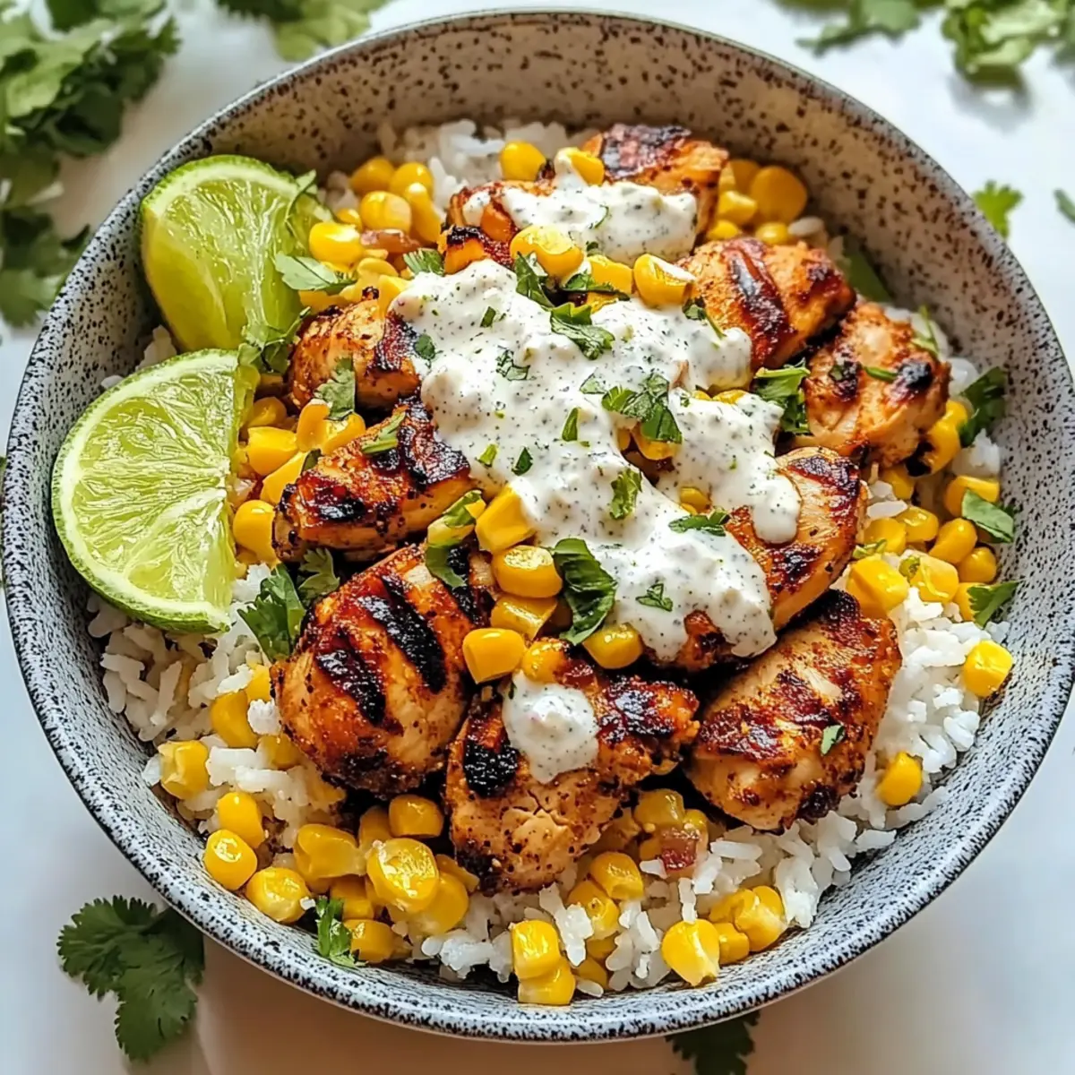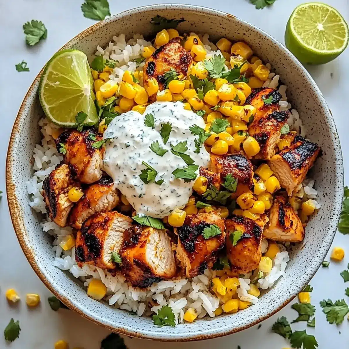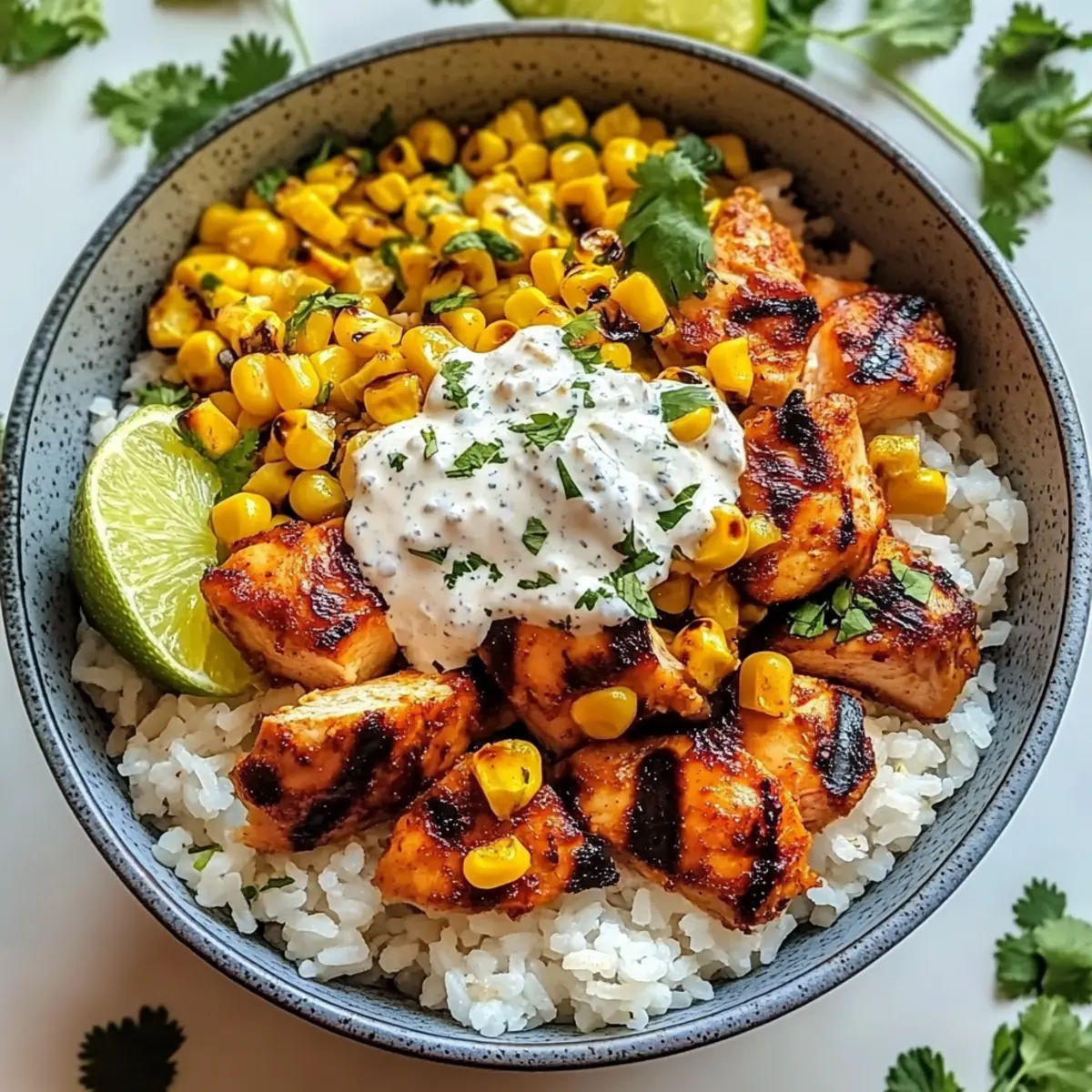 - Assemble the bowls by dividing rice into bowls, layering sliced chicken and corn mixture on top. Garnish with Cotija cheese, cilantro, and lime wedges.