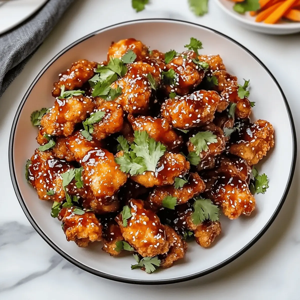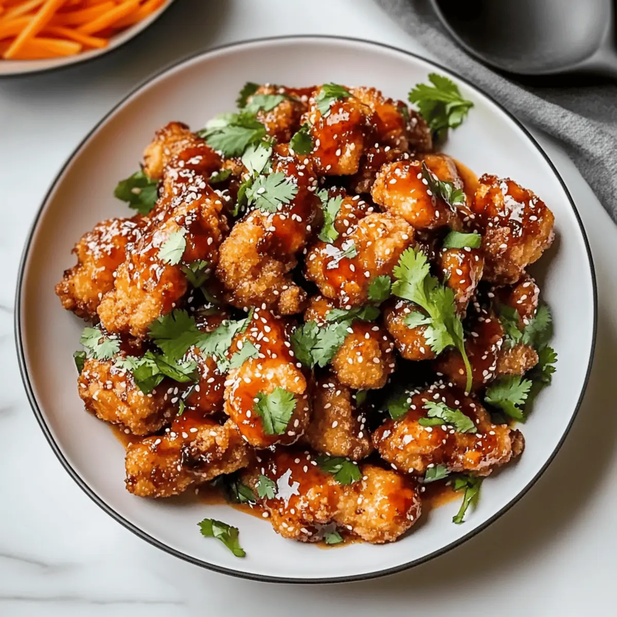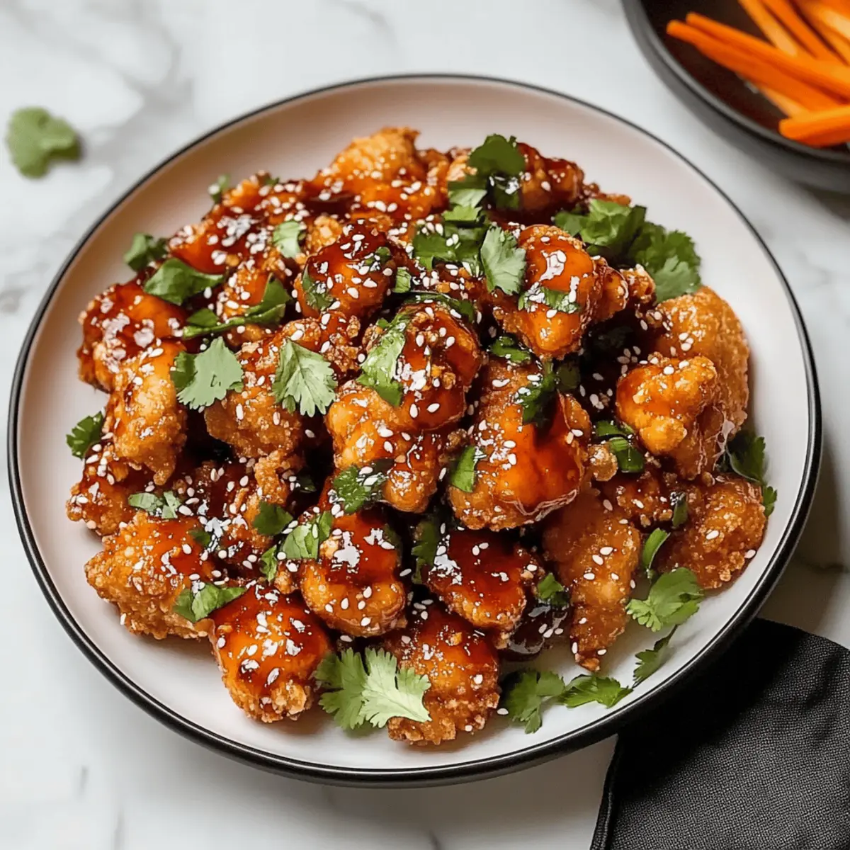 - Toss the fried chicken with sweet chili sauce and garnish with carrots, cilantro, and sesame seeds. Serve warm.